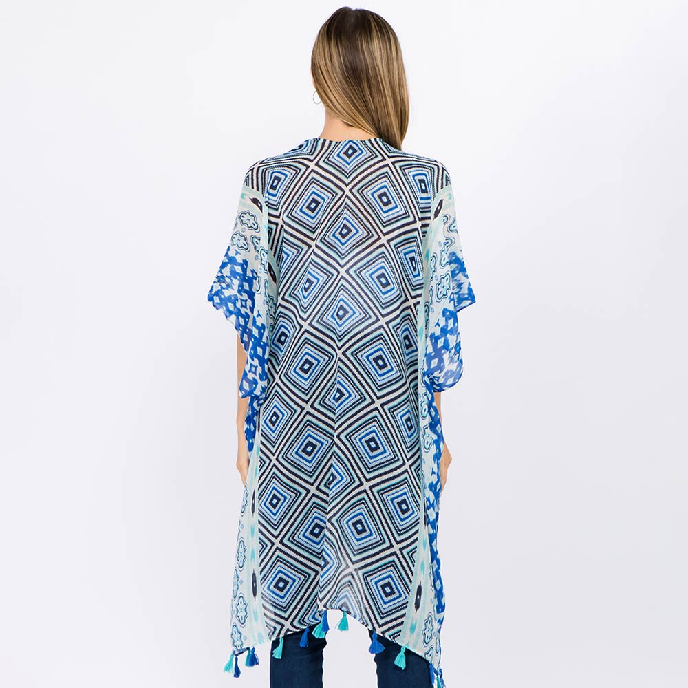 • Statement kimono cover up featuring an eye-catching geometric pattern and flowing open-front design. Finished with tassel accents for added movement, this versatile layering piece is ideal for boutique displays, resort wear edits, and effortless styling from casual outings to vacation looks.