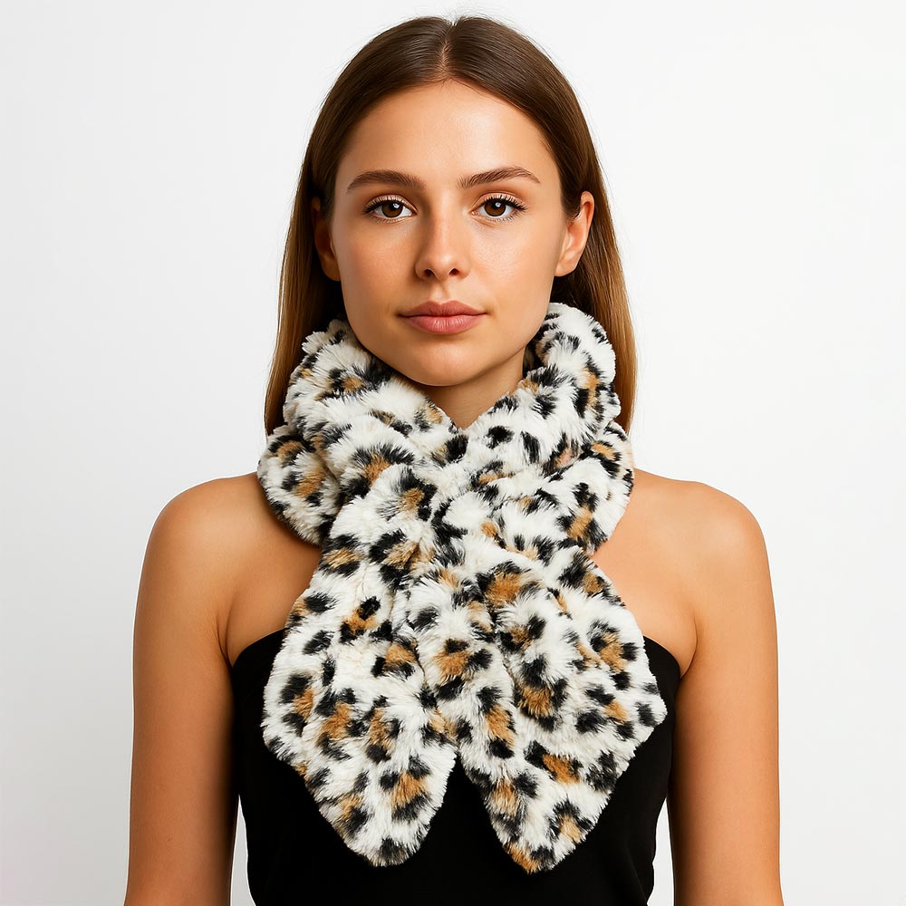 Details • Size : One Size • Material : 100% Viscose • Plush faux fur slip-through scarf designed with a bold animal print pattern. This cozy winter accessory combines warmth and style, making it perfect for layering with casual or dressy outfits. A soft, fashionable piece that elevates cold-weather looks effortlessly.