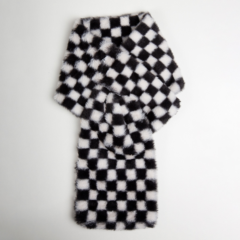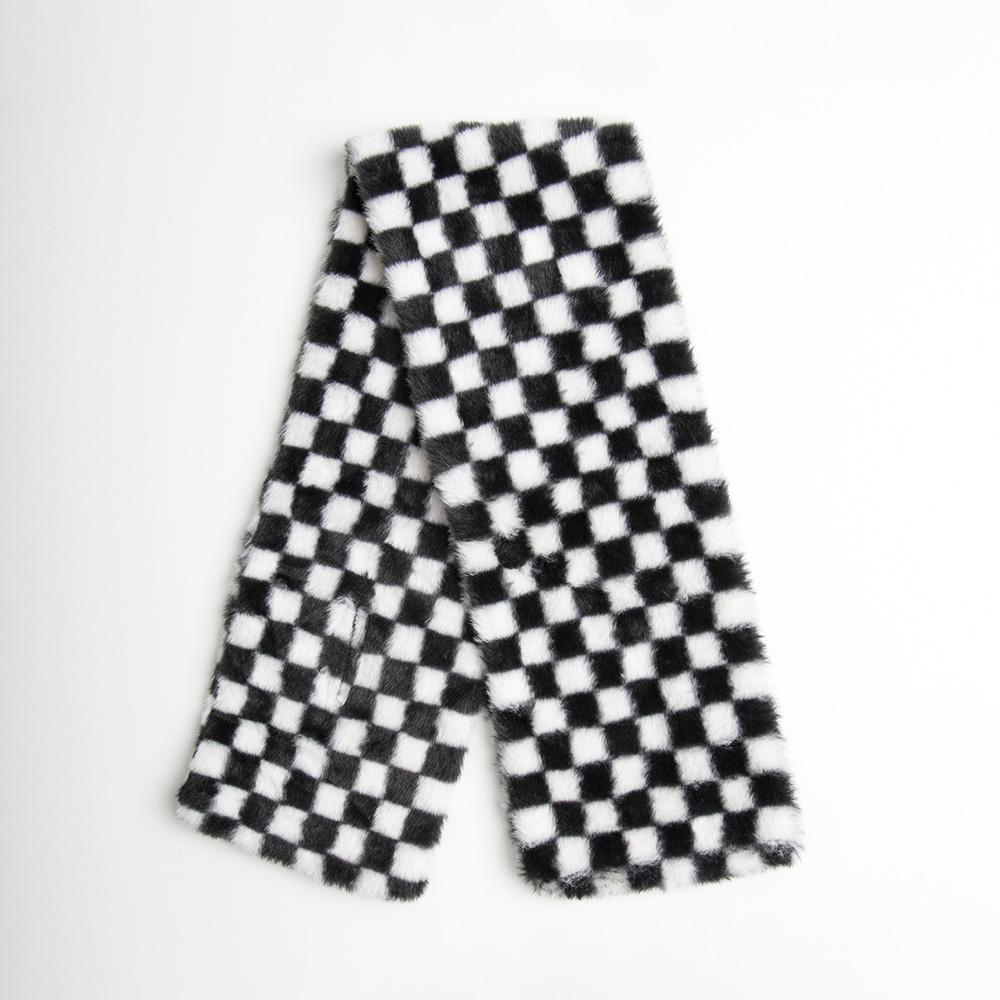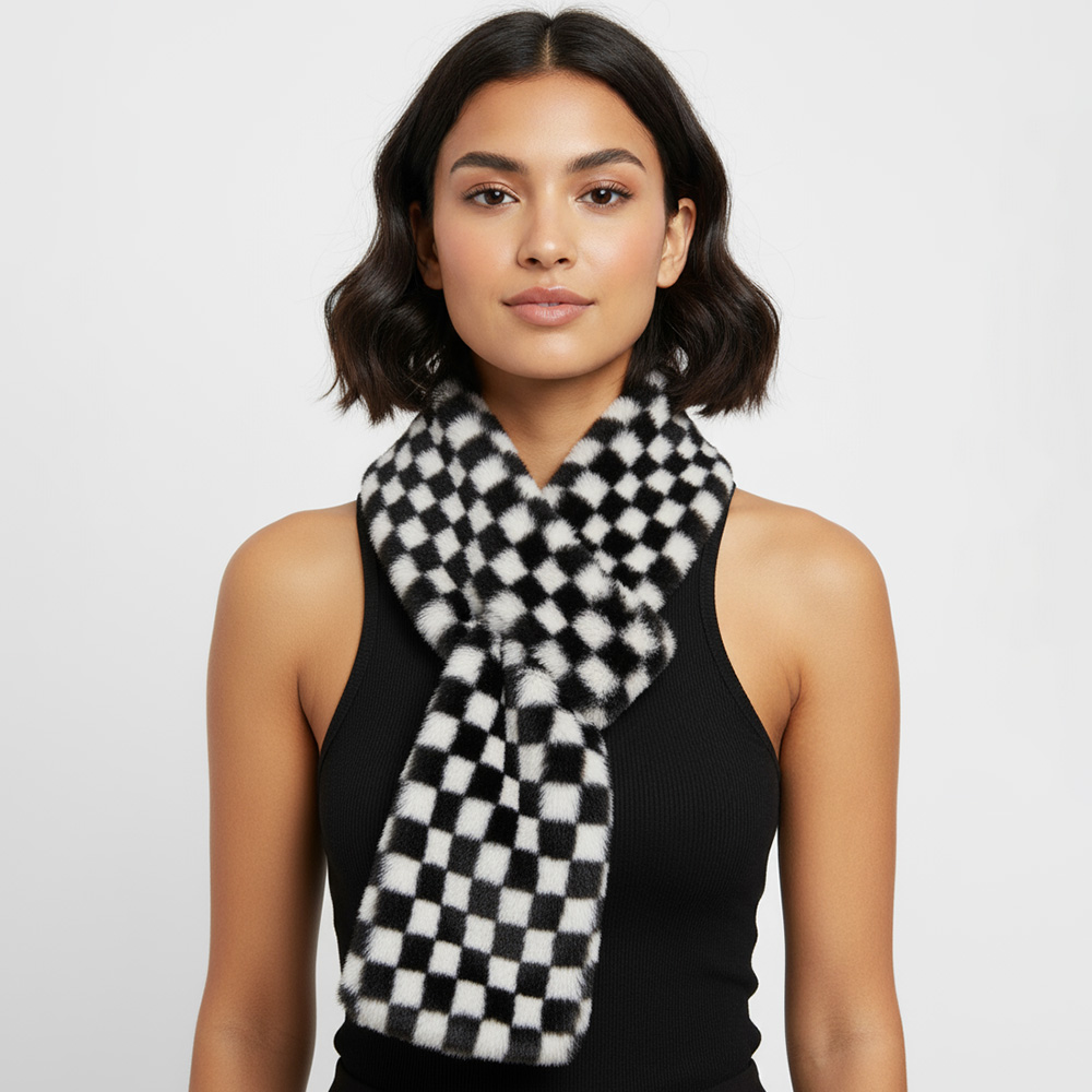 • Trendy faux fur scarf featuring a bold checkered pattern that adds modern flair to any outfit. Soft, cozy, and fashionable, this accessory is perfect for elevating casual or chic ensembles with a touch of statement style.