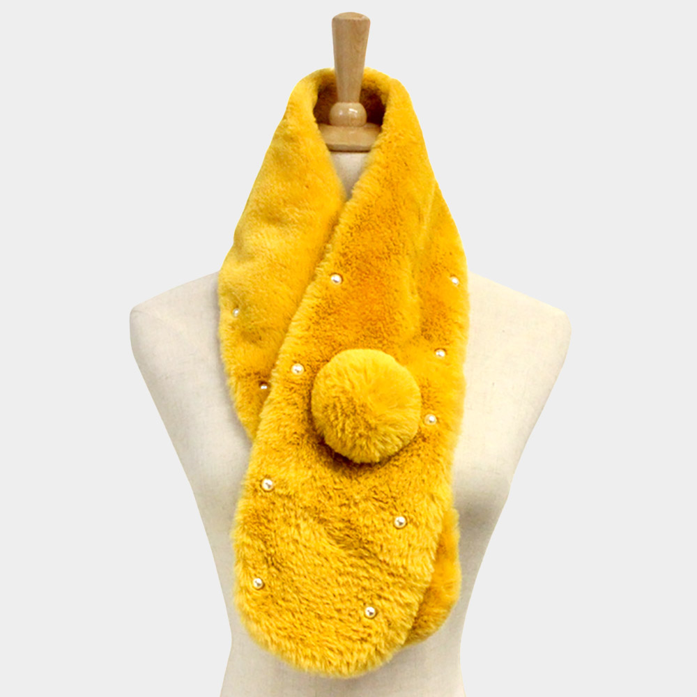 Pearl Embellished Faux Fur Pom Pom Pull Through Scarf