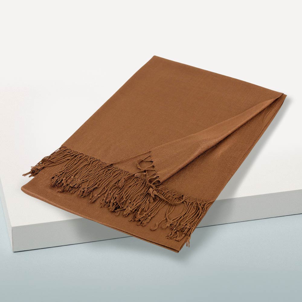 • Elegant pashmina scarf featuring a smooth rectangular drape and finely knotted fringe ends. Lightweight and versatile, it offers a classic silhouette ideal for layering, evening wear, or adding refined detail to everyday outfits.