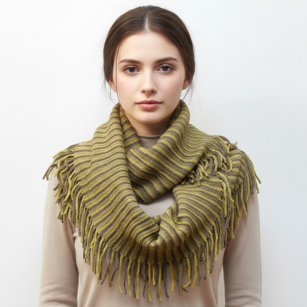 Details • Size : 16" X 70" • Material : 100% Acrylic • Add a touch of texture and warmth with this striped knit infinity scarf featuring playful fringe edges. Its soft, looped design makes it perfect for cozy layering, effortlessly enhancing your seasonal wardrobe with casual elegance and everyday comfort.
