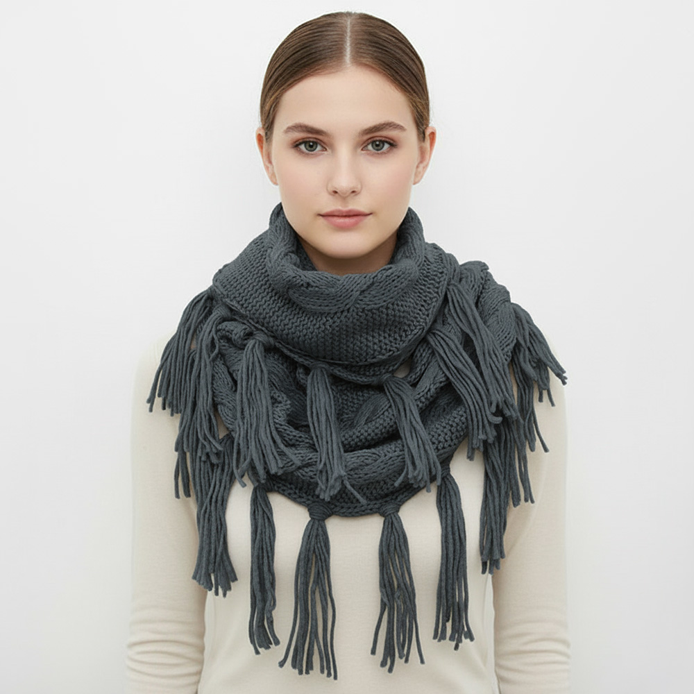 • Wrap yourself in cozy comfort with this chunky knit infinity scarf featuring long tassel fringe. Its thick texture and draped design provide warmth and modern flair, making it an ideal accessory for elevating cold-weather looks with effortless sophistication.