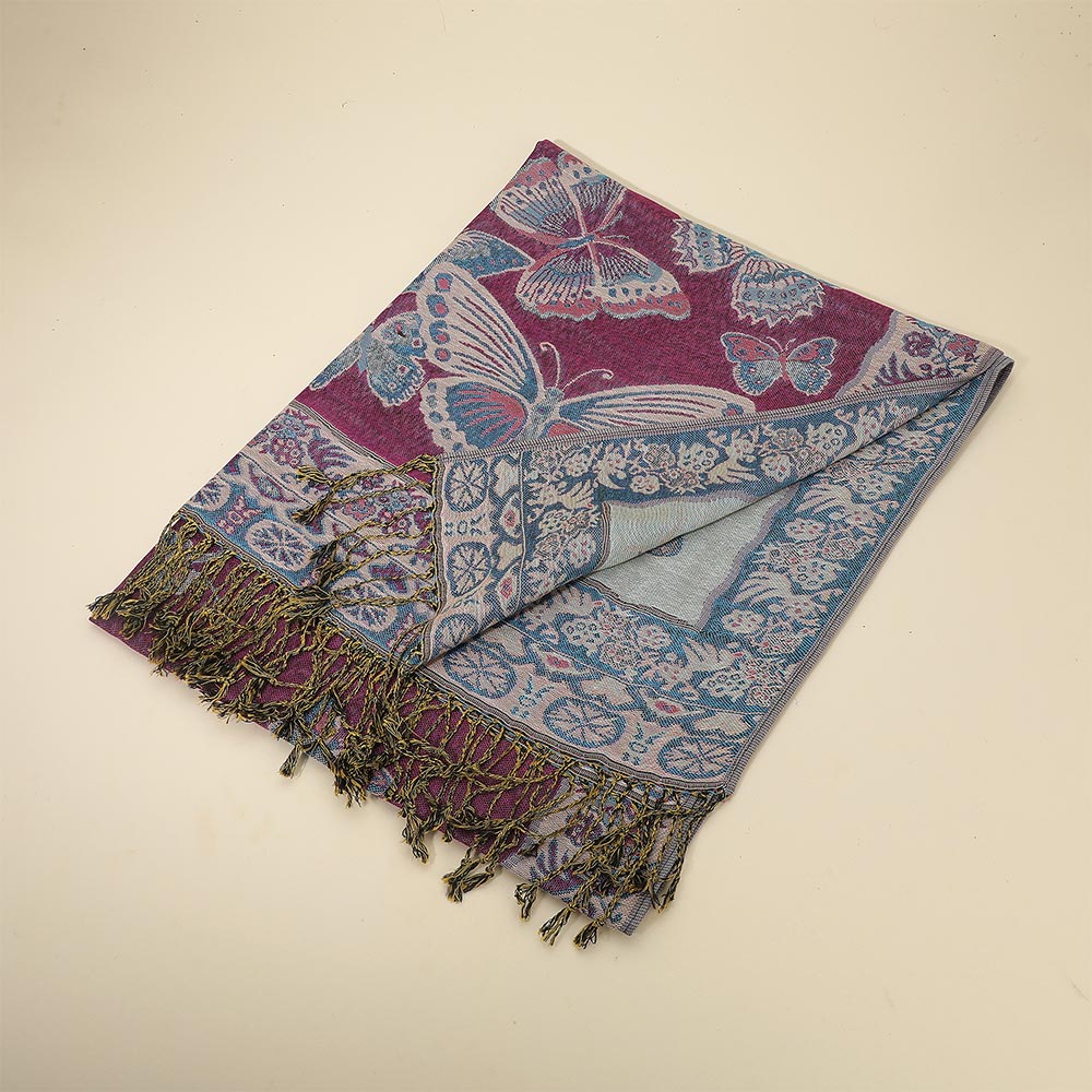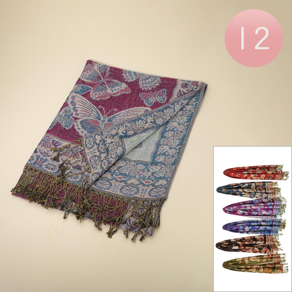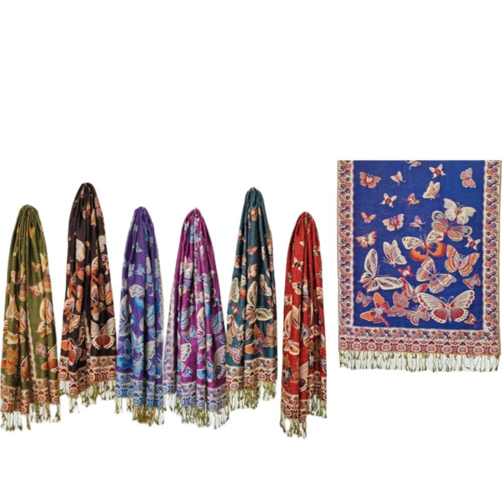 Details • Size : 28" X 78" • Material : 100% Pashmina • Elegant butterfly patterned scarf set designed with intricate jacquard details and fringe edges. Versatile as a shawl, wrap, or neck accessory, this collection offers a mix of assorted styles, making it perfect for gifting, layering, and elevating everyday outfits with timeless charm.