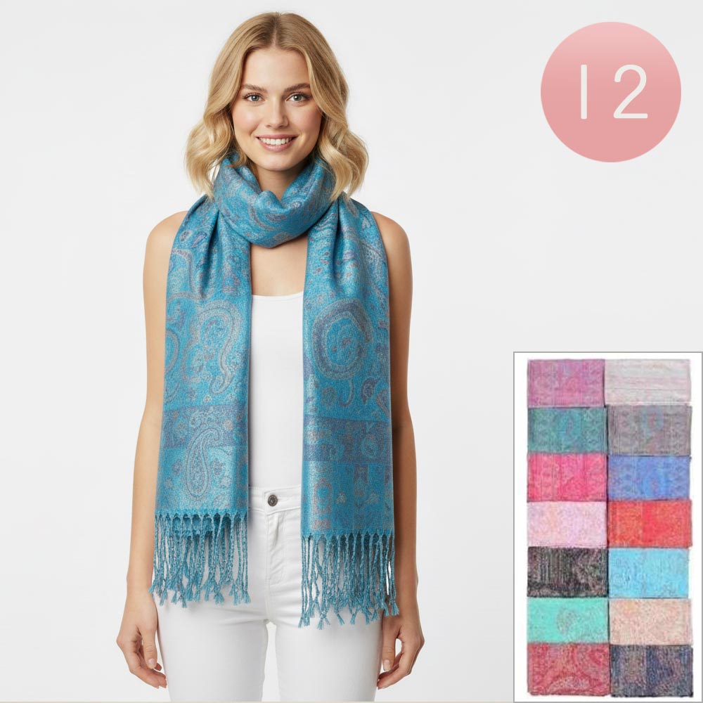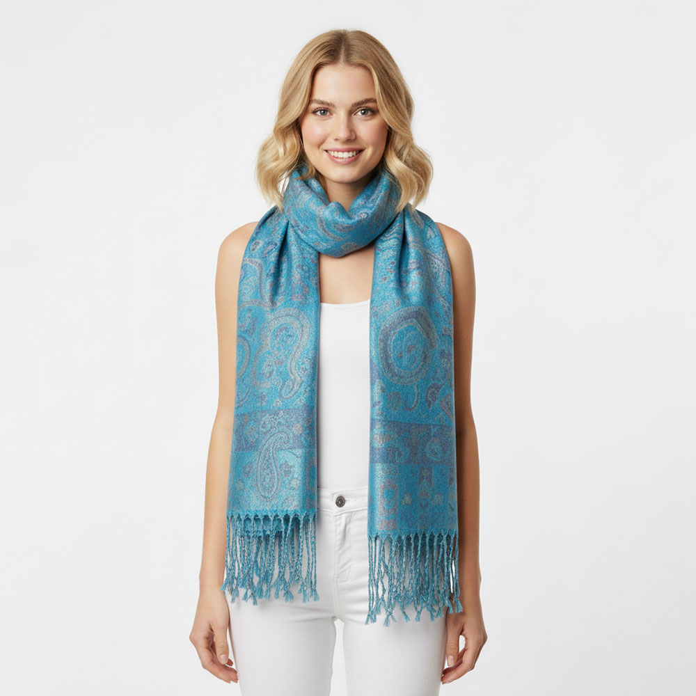 Details • Size : 28" X 78" • Material : 100% Pashmina • Stylish paisley scarf with fringed edges, designed in assorted styles for versatile wear. Perfect as a wrap, shawl, or lightweight cover-up, it adds elegance to both casual and formal outfits. Timeless and practical, this accessory is ideal for year-round layering and effortless fashion.