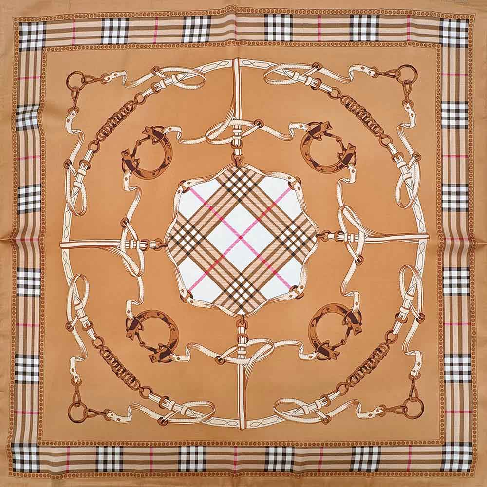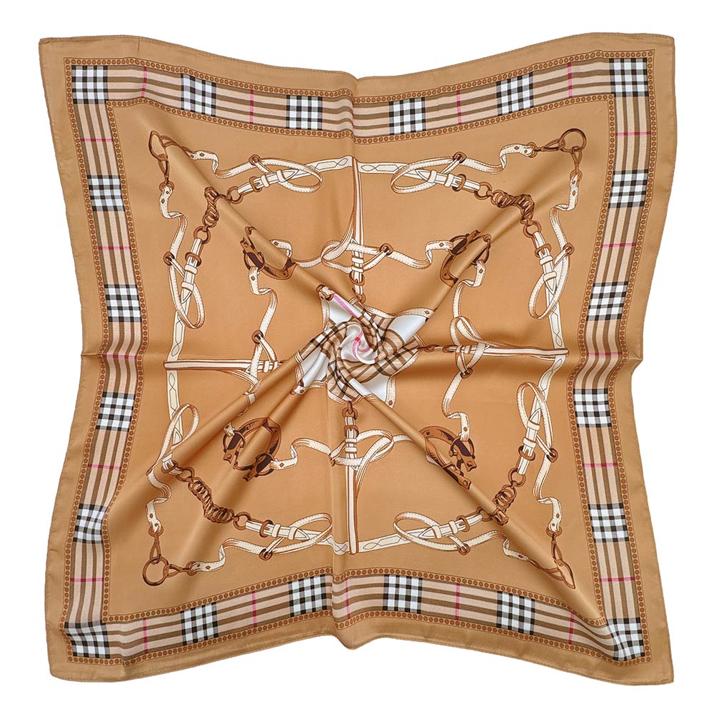 • This square fashion scarf showcases a refined equestrian-inspired design with interlocking chain, buckle, and plaid-style motifs framed by a structured border. A polished accessory that adds sophistication to everyday outfits, it can be styled around the neck, hair, wrist, or handbag. Perfect for boutiques seeking timeless statement scarves with classic detailing, strong visual balance, and versatile styling appeal suitable for both casual and elevated looks.