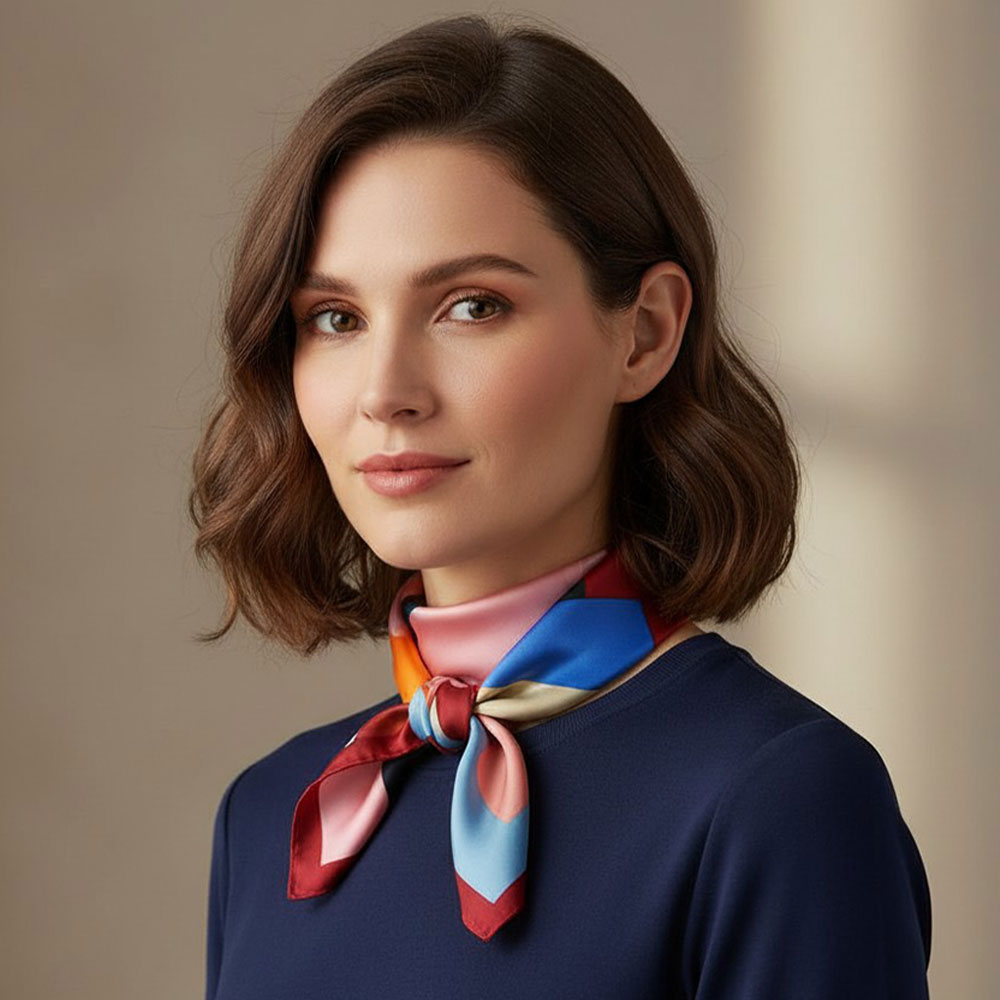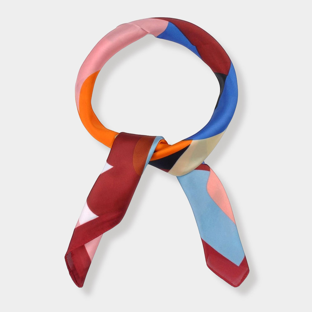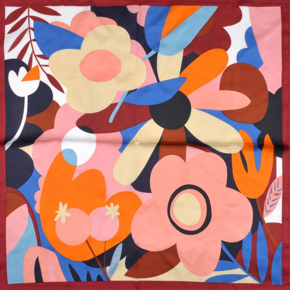 Details • Size : 27.5" X 27.5" • Material : 100% Polyester • Add vibrant elegance to any outfit with this square scarf featuring an expressive abstract floral design. Its bold, artistic pattern elevates everyday looks, making it a standout accessory for styling around the neck, hair, or handbag with ease.