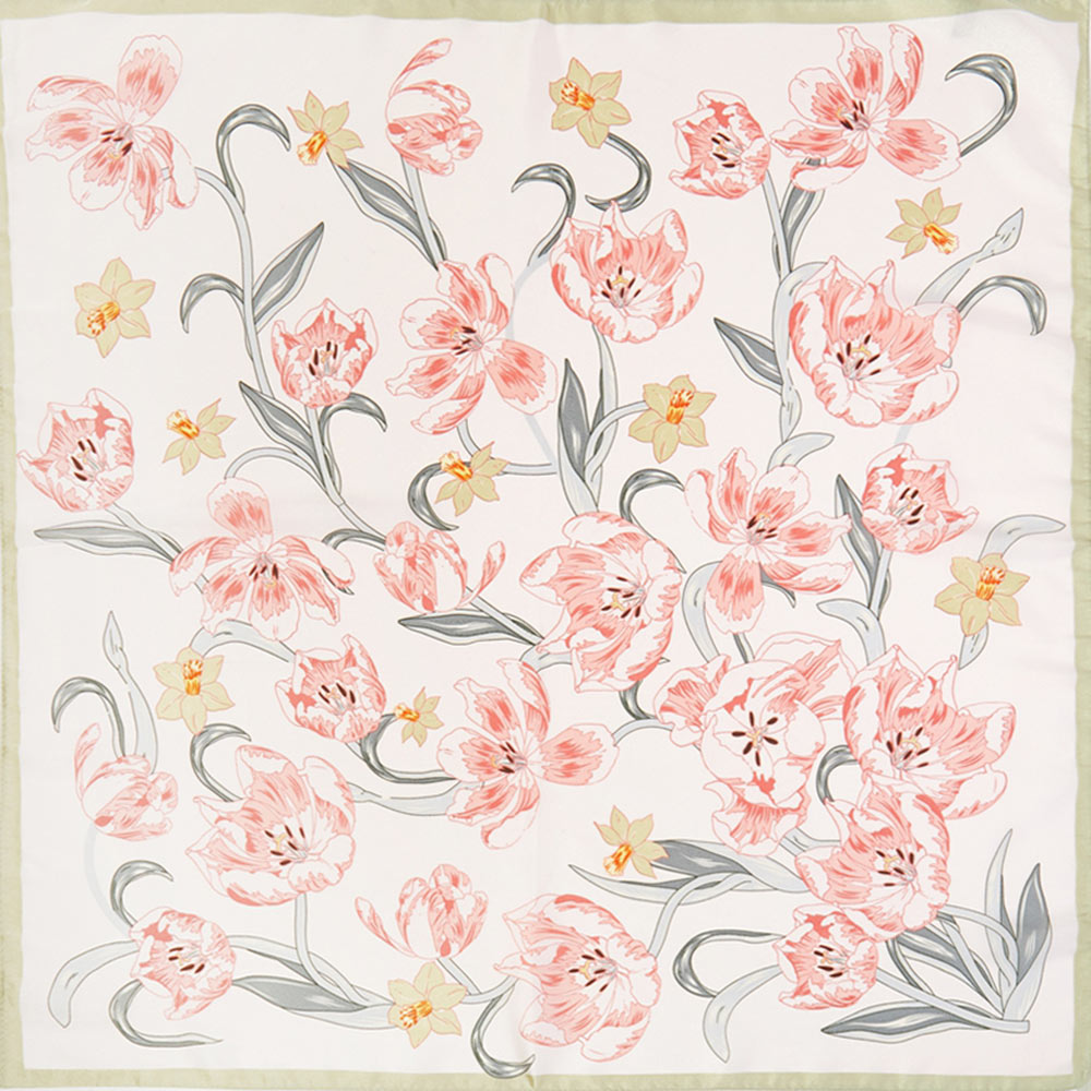 Details • Size : 27.5" X 27.5" • Material : 100% Polyester • Add a refined touch to your wardrobe with this beautifully patterned square scarf featuring an intricate floral design. Its versatile layout complements casual and dressy looks, perfect for wearing around the neck, in the hair, or tied to a handbag for effortless sophistication.