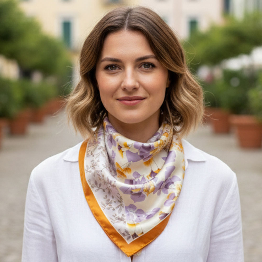 • Elevate everyday style with this floral patchwork square scarf featuring a blend of botanical patterns and delicate garden-inspired motifs. Soft and lightweight, it’s ideal for wearing around the neck, in hair, or tied to a bag. A versatile accessory that adds charm, pattern, and sophistication to casual outfits, workwear, and travel looks.