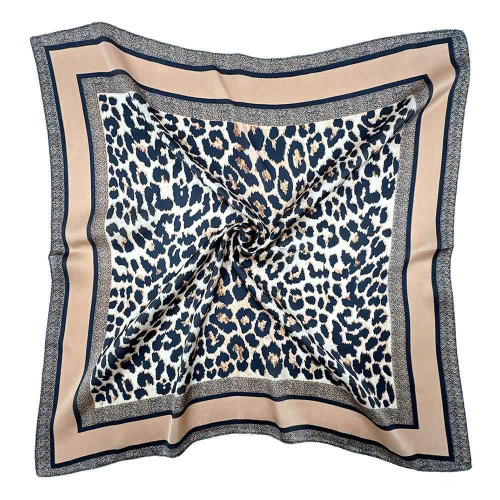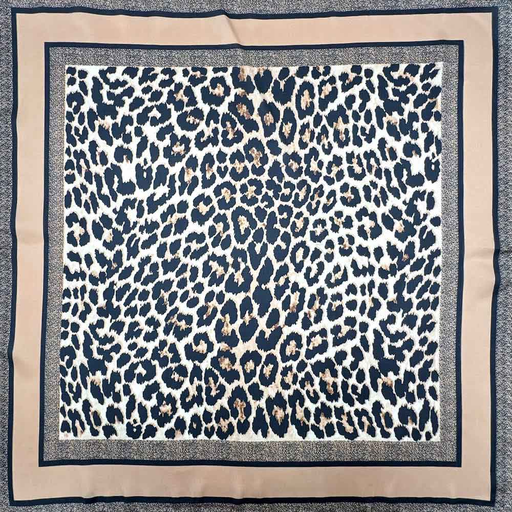 • This square fashion scarf features a bold leopard-inspired pattern framed by a refined border for a balanced, statement-making look. Designed for versatile styling around the neck, hair, or handbag, it instantly elevates everyday and dressy outfits. A timeless accessory that blends classic animal-inspired design with modern appeal, perfect for boutique assortments seeking trend-forward scarves with multiple styling options.