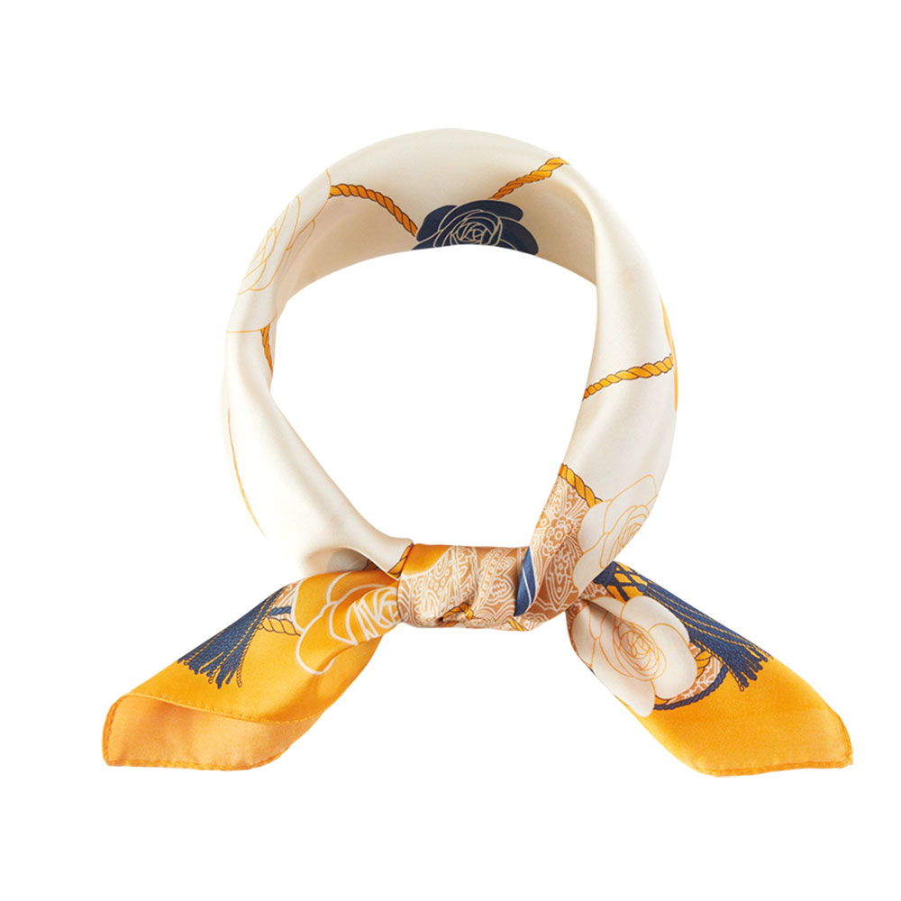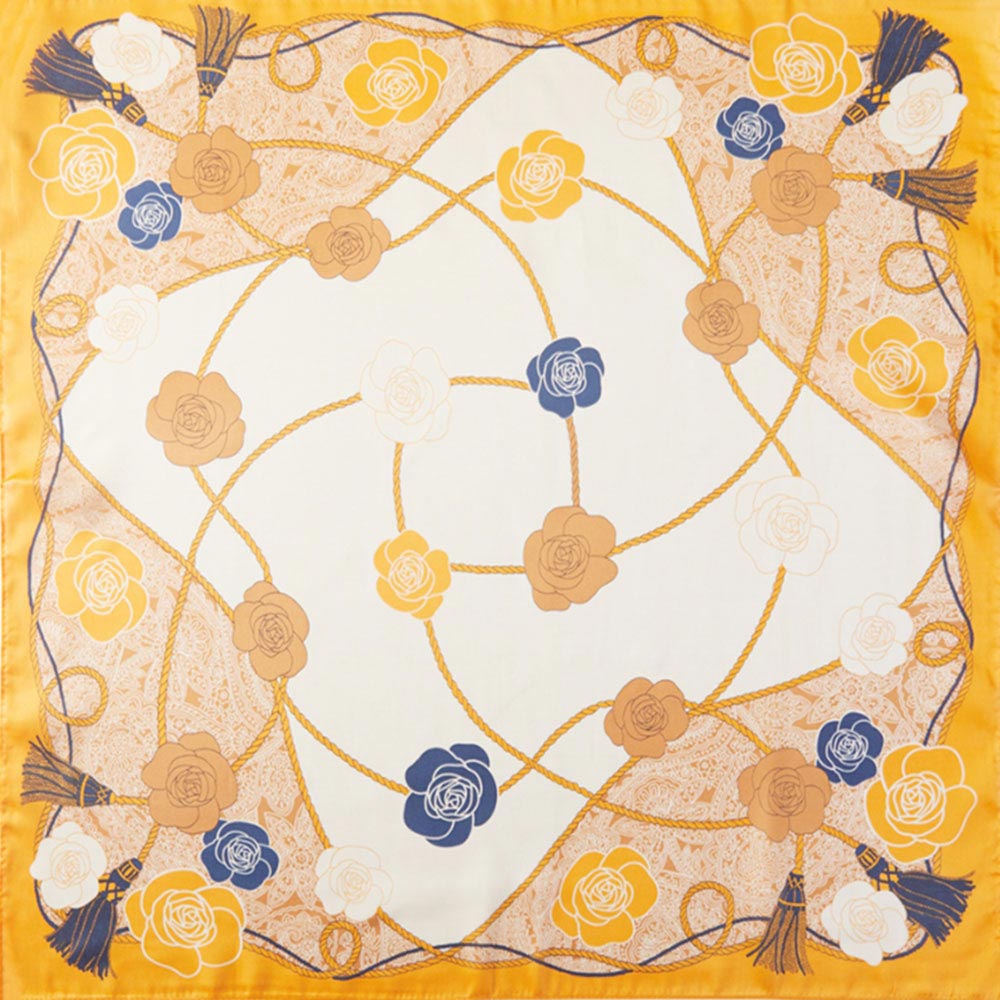 Details • Size : 27.5" X 27.5" • Material : 100% Polyester • Capture a chic, preppy look with this charming square satin-feel scarf. The unique design features stylized roses connected by an intertwined rope pattern, framed by a decorative tassel border and subtle paisley elements. The smooth, luxurious fabric and vibrant, balanced colors make this accessory a delightful statement piece for a classic, sophisticated style. Perfect as a neckerchief or tied to a handbag.