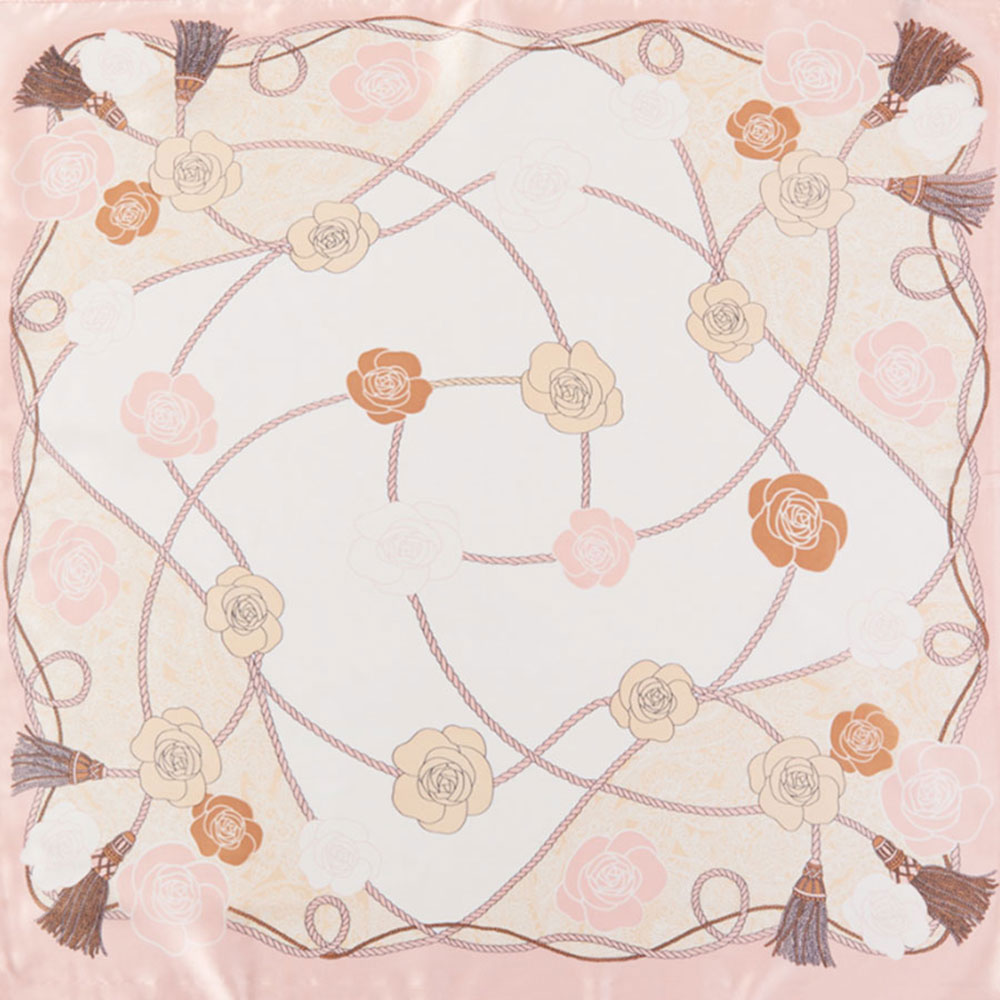 Details • Size : 27.5" X 27.5" • Material : 100% Polyester • Capture a chic, preppy look with this charming square satin-feel scarf. The unique design features stylized roses connected by an intertwined rope pattern, framed by a decorative tassel border and subtle paisley elements. The smooth, luxurious fabric and vibrant, balanced colors make this accessory a delightful statement piece for a classic, sophisticated style. Perfect as a neckerchief or tied to a handbag.