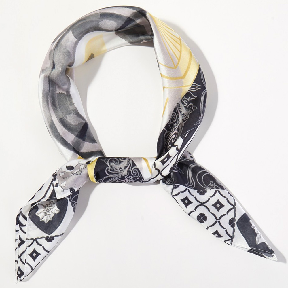 • Statement square scarf featuring an artistic citrus fruit and floral motif with an ornate medallion center and decorative border. Designed for versatile styling on the neck, hair, handbag, or wrist. Ideal for boutique assortments, seasonal displays, and everyday fashion-forward accessorizing.