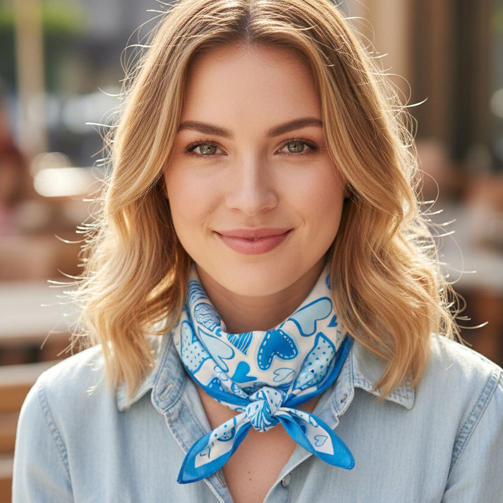 Details • Size : 27.5" X 27.5" • Material : 100% Polyester • Stylish square scarf featuring an abstract heart print with playful shapes and modern line details. Designed for versatile styling on the neck, hair, wrist, or handbag. A trendy accessory for boutiques, gift shops, seasonal collections, and everyday fashion displays.
