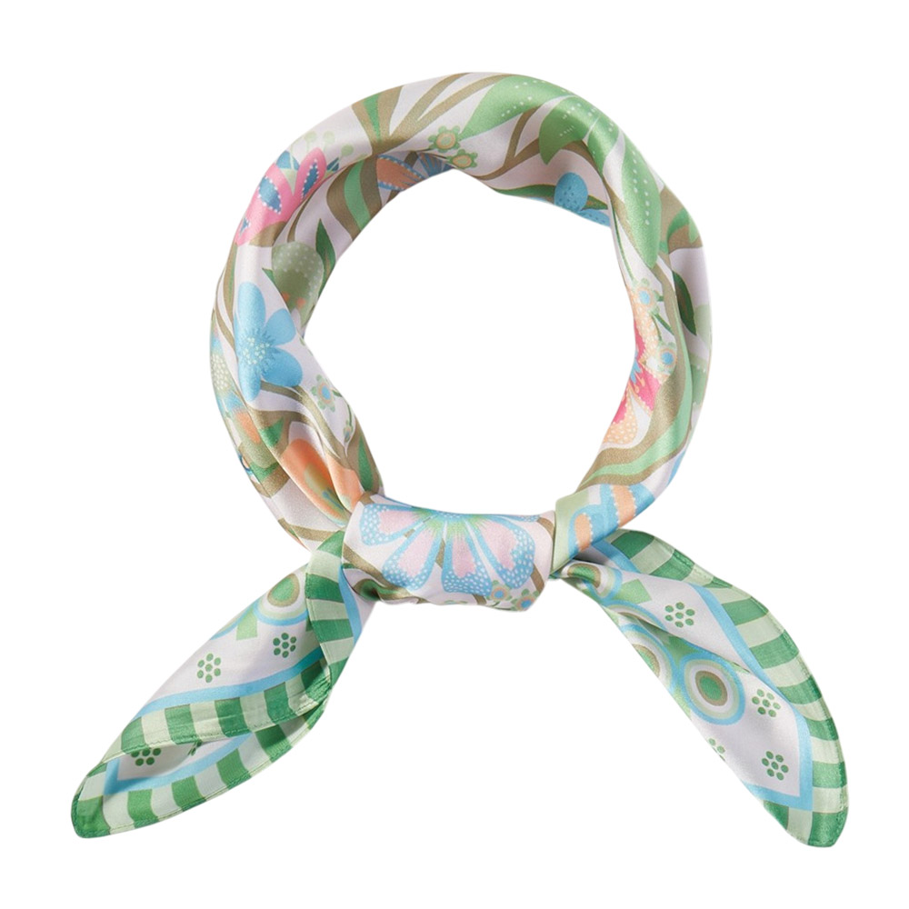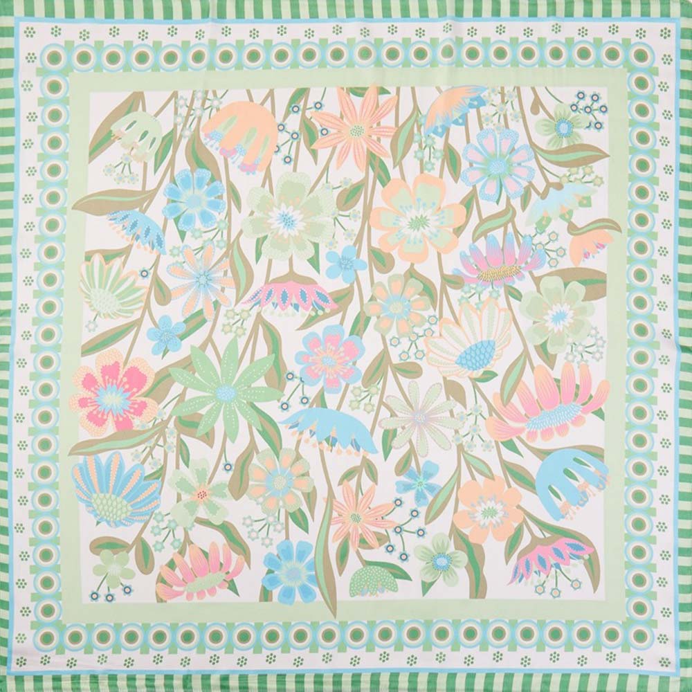 • Square fashion scarf featuring a detailed botanical meadow design with layered floral illustrations and decorative borders. Ideal for styling on the neck, hair, wrist, or handbag, this versatile accessory brings a fresh, artistic accent to everyday looks, seasonal outfits, and curated boutique collections.