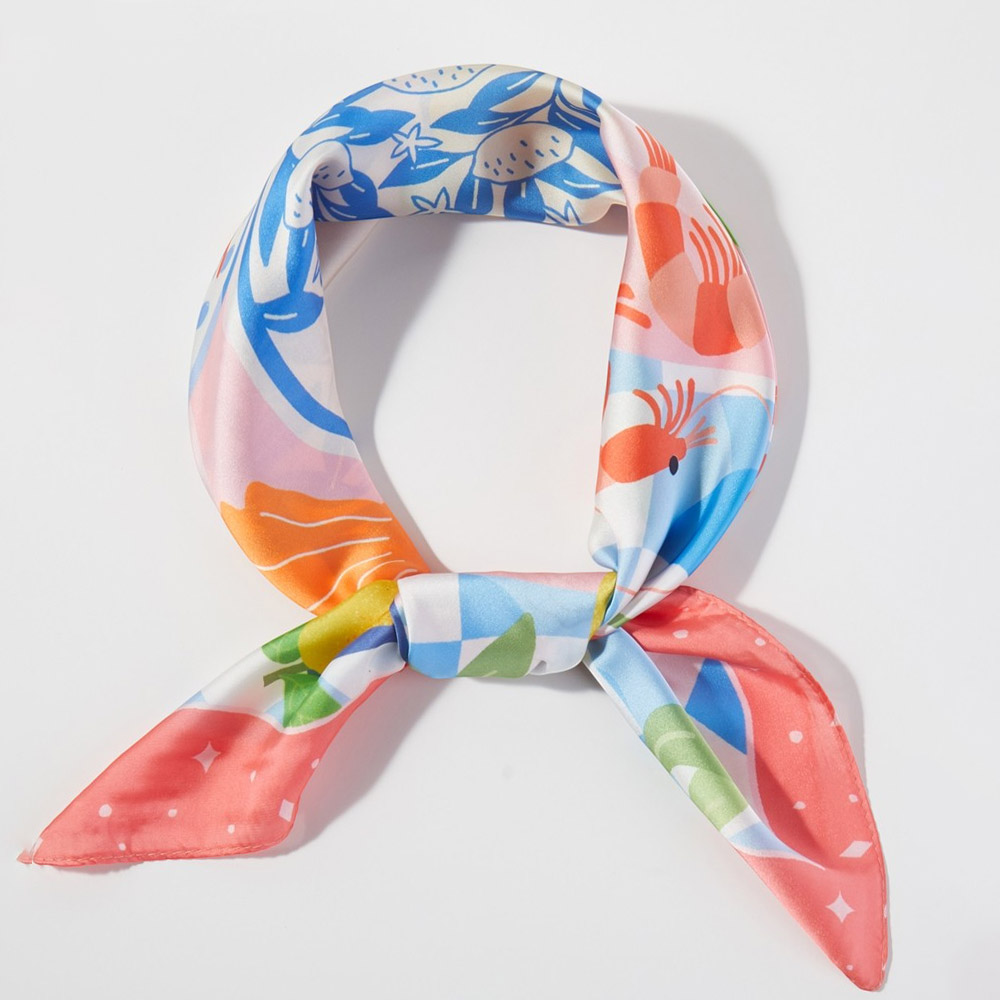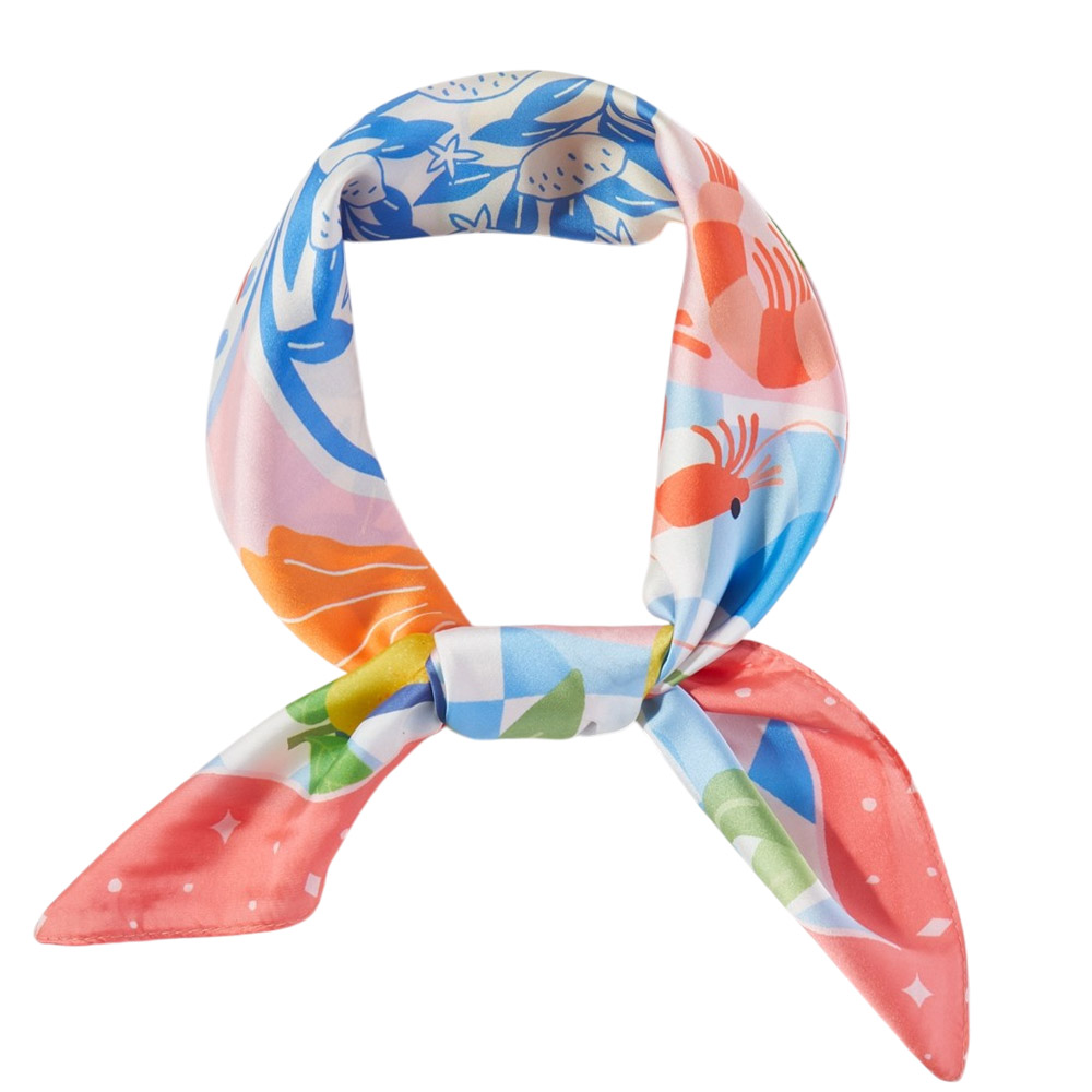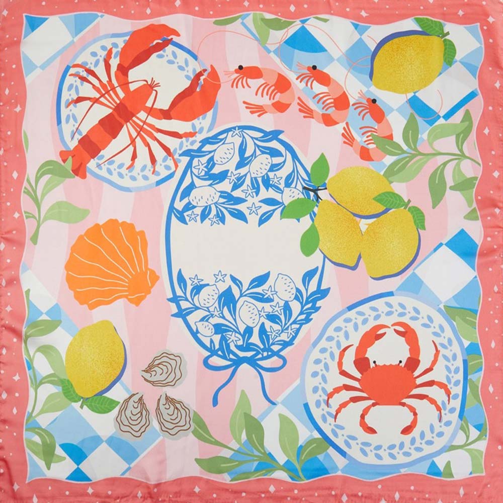 • Square fashion scarf featuring a playful coastal seafood and citrus inspired illustration with decorative motifs. Designed for versatile styling as a neck scarf, hair wrap, or bag accent, offering boutiques a fresh, eye-catching accessory that works for seasonal collections, resort edits, and everyday statement looks.