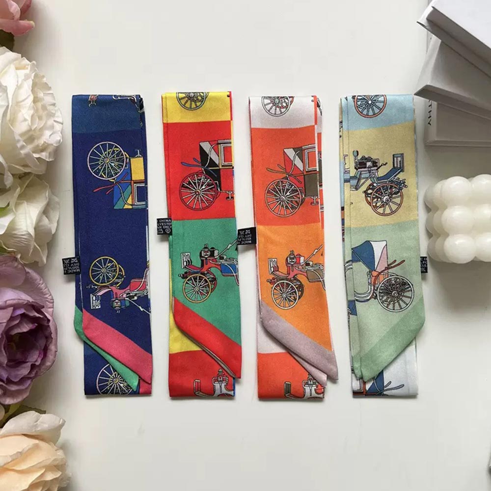 • Stylish twilly scarf featuring a classic bicycle-inspired pattern designed for versatile accessorizing. Perfect for wrapping on handbags, tying around the neck, wrist, or hair for a polished accent. A lightweight fashion accessory that adds charm, personality, and everyday elegance to casual or dressed-up looks.