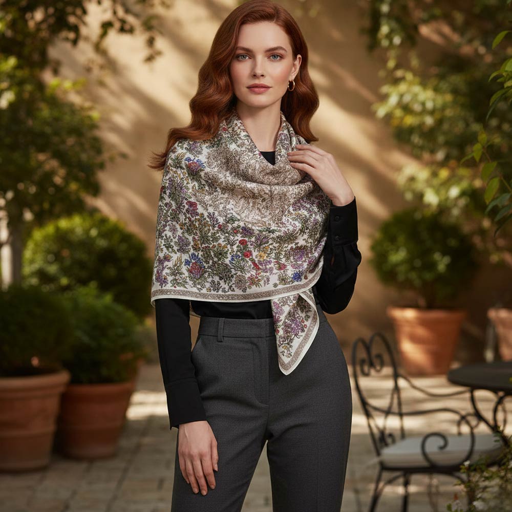 Details • Size : 35" X 78" • Material : 100% Viscose • Breathable, Lightweight, Skin-friendly and Soft • This vintage botanical square scarf features an intricate floral pattern with a classic balanced layout. Designed for versatile styling, it can be worn around the neck, hair, handbag, or shoulders. A timeless accessory ideal for boutiques, gifting, seasonal collections, and everyday outfits with an elegant touch.