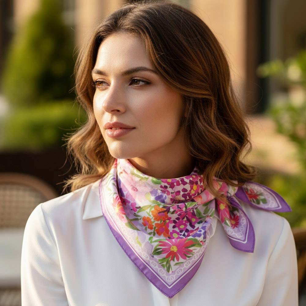 • Elegant square fashion scarf showcasing a vintage-inspired floral garden pattern with layered botanical details. Designed for versatile styling on the neck, hair, wrist, or handbag, this timeless accessory adds a soft romantic touch to everyday outfits, seasonal collections, and curated boutique assortments.