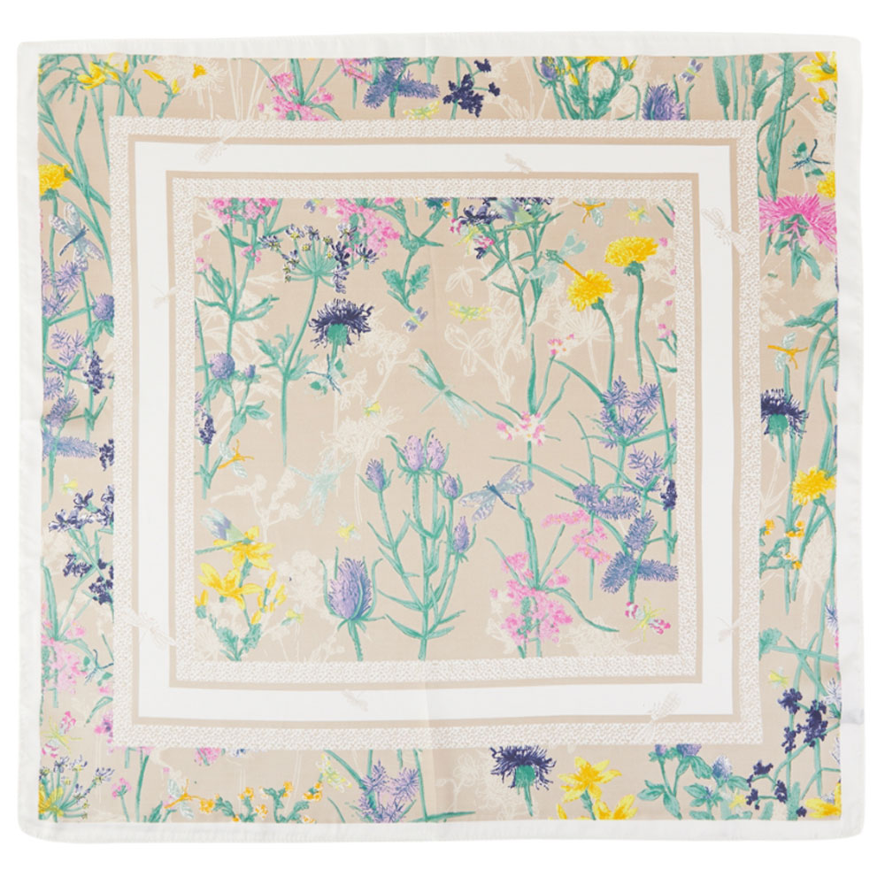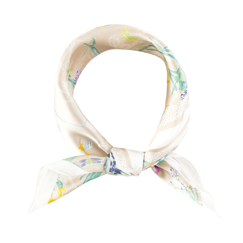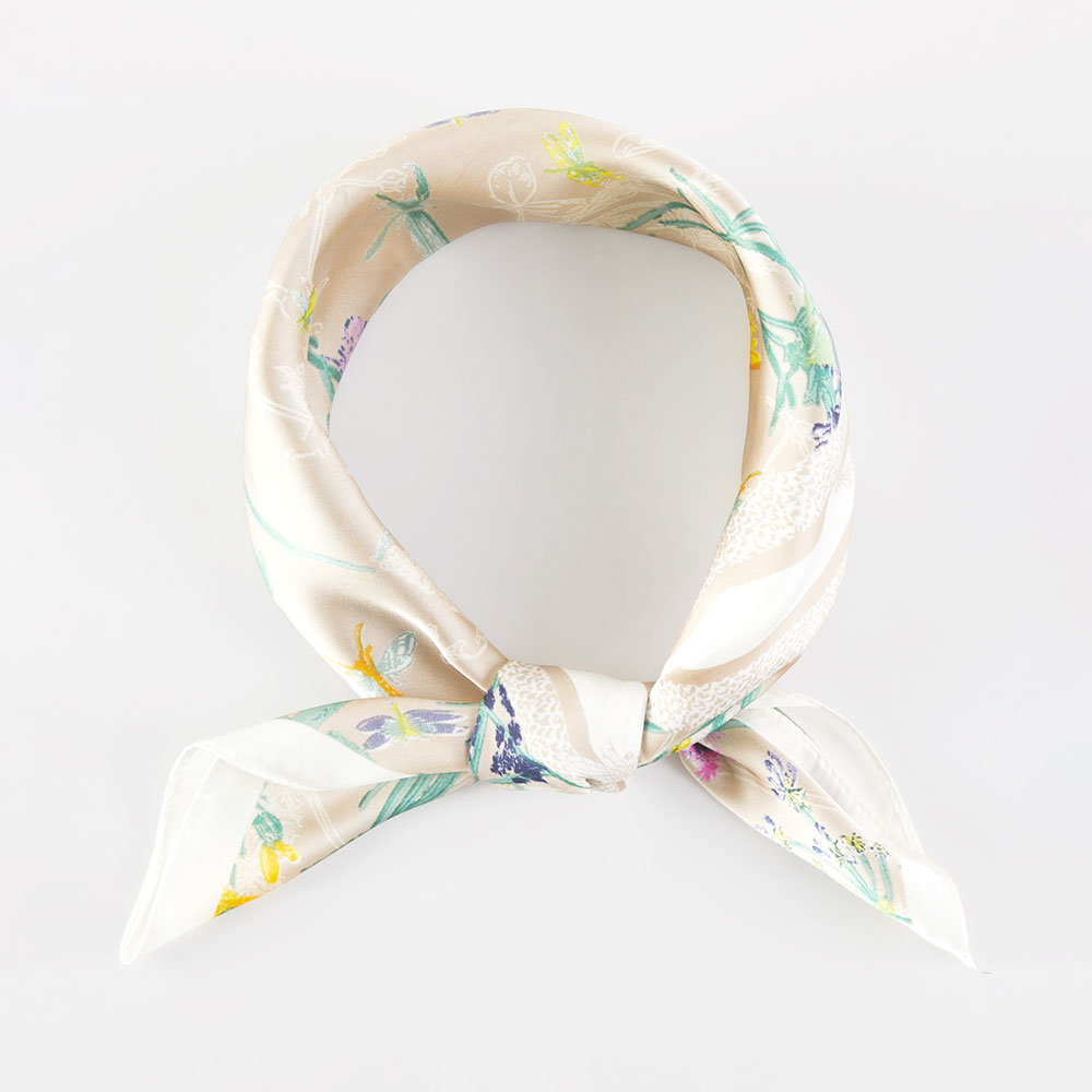 Details • Size : 27.5" X 27.5" • Material : 100% Polyester • This square scarf showcases a delicate botanical pattern that adds an elegant, nature-inspired touch to any outfit. Its lightweight design makes it perfect for styling as a neck wrap, hair accessory, or bag accent, bringing subtle charm and versatility to everyday looks.