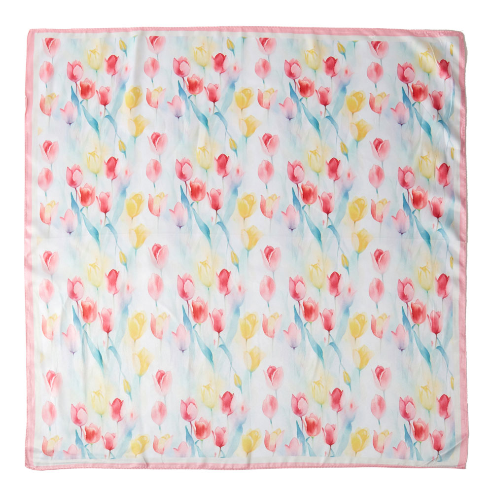 • This square scarf features a soft watercolor tulip design that adds a fresh, romantic touch to any look. Its lightweight feel and versatile styling options make it ideal as a neck scarf, hair accessory, or bag accent, bringing graceful charm to everyday outfits.