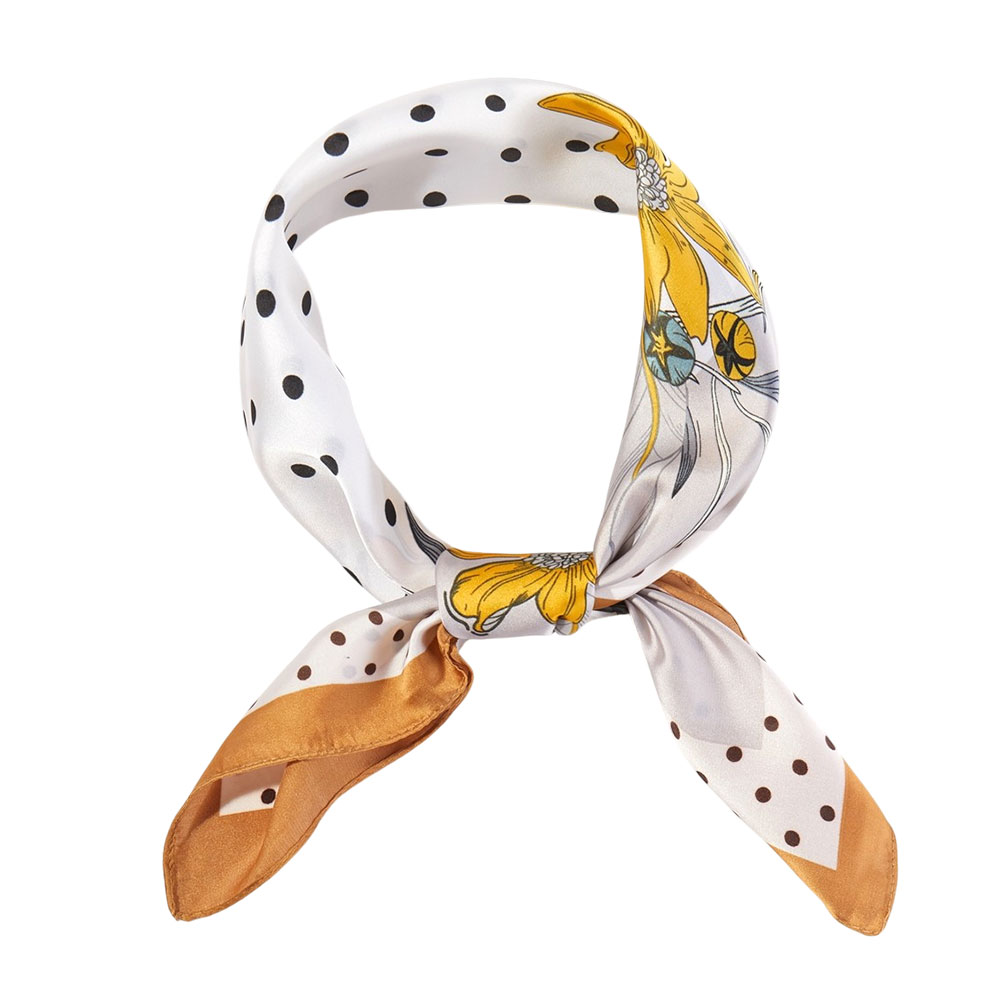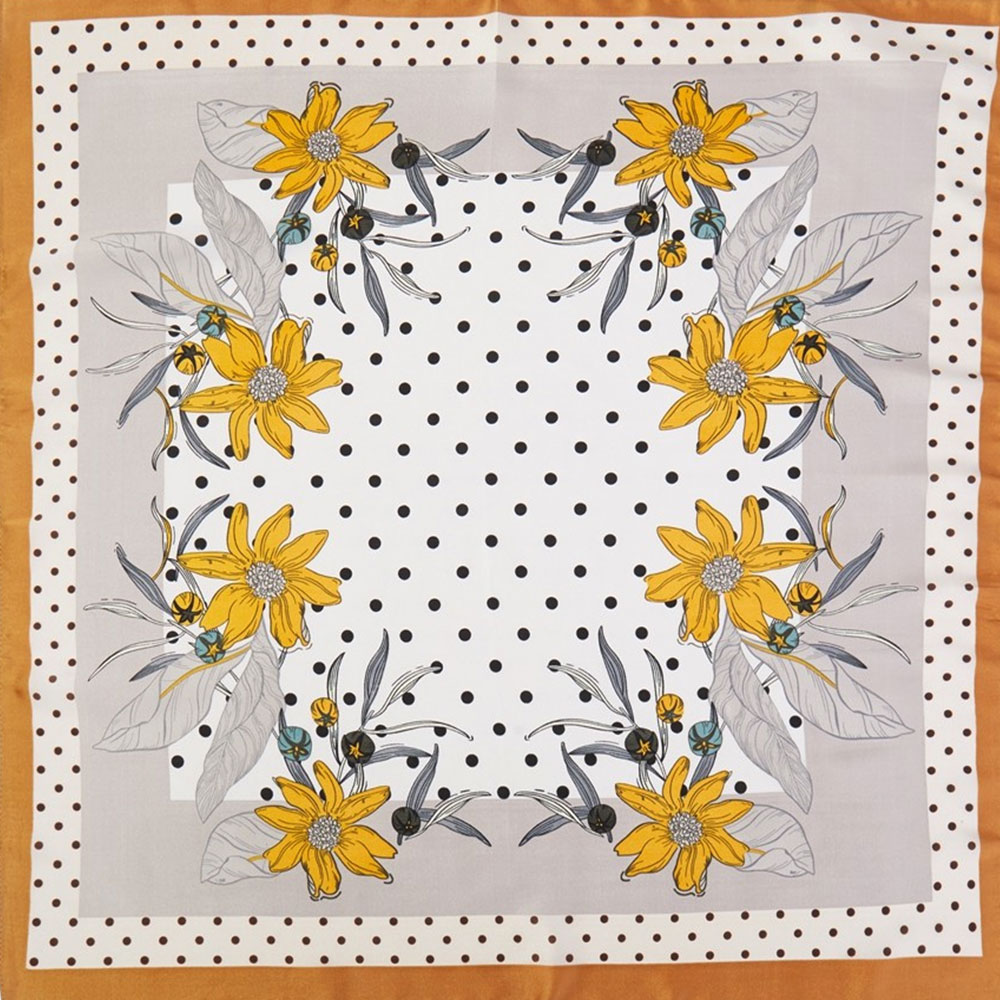 Details • Size : 27.5" X 27.5" • Material : 100% Polyester • Elegant square fashion scarf featuring a floral border with classic polka dot detailing. Designed for versatile styling around the neck, hair, handbag, or wrist, this timeless accessory adds a refined, feminine accent to everyday looks, seasonal outfits, and curated boutique collections.