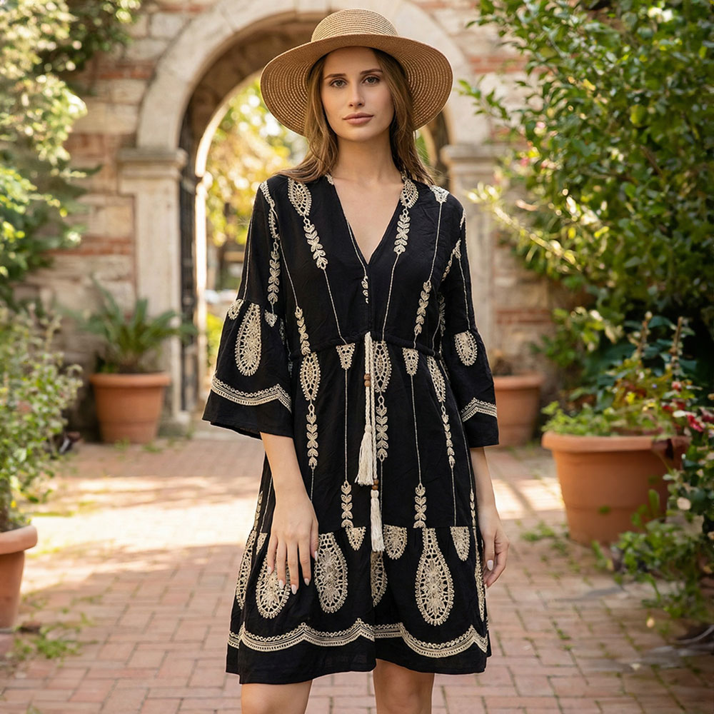 • Stylish bohemian mini dress with intricate embroidery, flared sleeves, and tassel ties for an effortlessly chic look. Comfortable fit, lightweight fabric, perfect for casual outings or beach vacations.