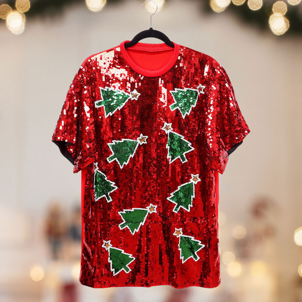 Details • Size : One Size • Bust Size : 42" - 45" L, Length : 30" L • Material : 100% Polyester • Sparkle with seasonal charm in this plus size sequin Christmas tree dress, featuring playful holiday motifs and a shimmering finish. Perfect for Christmas parties, family gatherings, or festive photos, this cheerful dress brings joy and holiday spirit to every celebration.