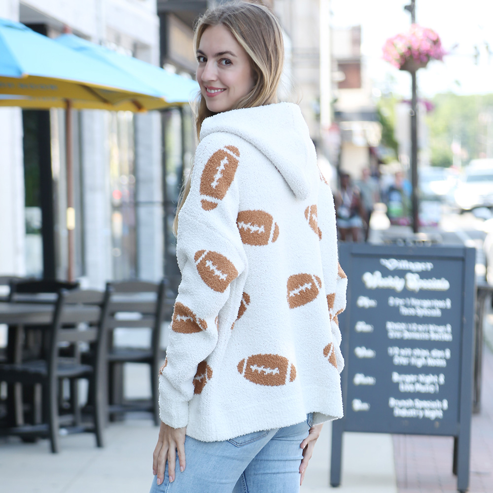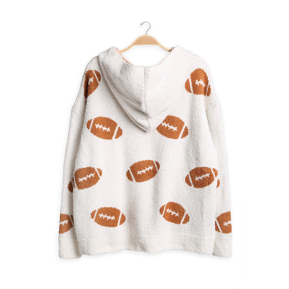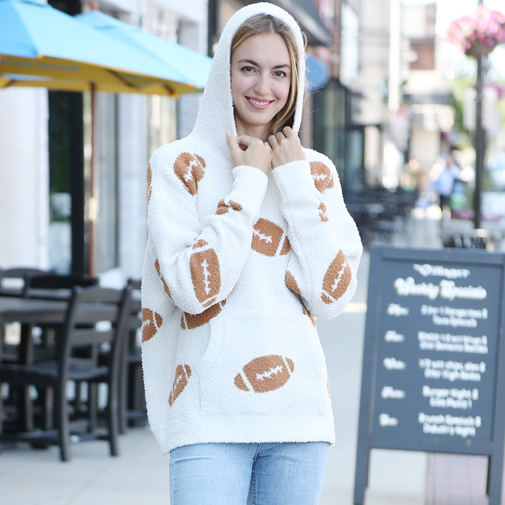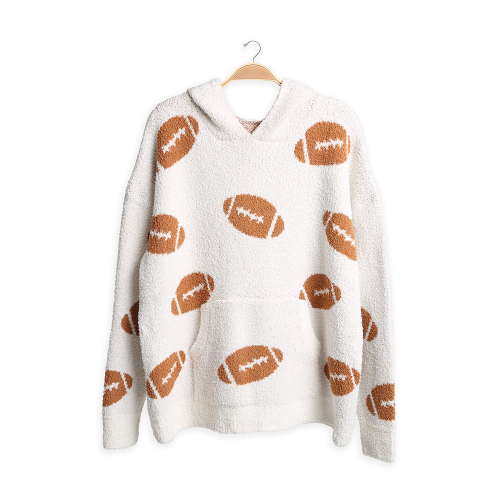 Details • Size : One Size • Material : 100% Poly.Microfiber • Stay warm and stylish with this cozy hooded pullover featuring an allover football pattern. Designed with a relaxed fit, kangaroo pocket, and soft textured fabric, it’s perfect for lounging, casual outings, or layering on chilly days with effortless comfort.