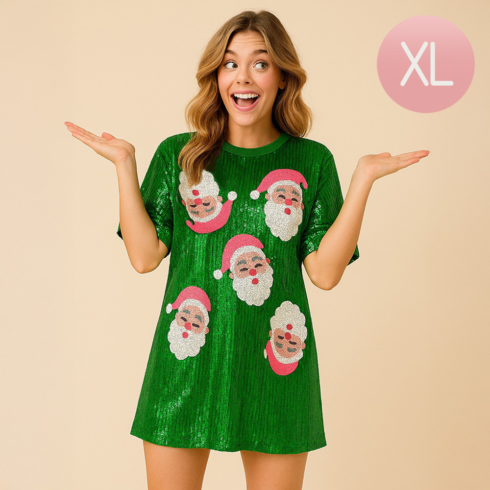 Details • Size : X-Large • Bust Size : 48" - 50" L • Length : 31" L • Material : 100% Polyester • Spread Christmas cheer in this sequin Santa face dress, designed to sparkle at every festive celebration. With its playful holiday motif and shimmering finish, this fun and stylish dress is perfect for parties, family gatherings, or any occasion that calls for a merry holiday look.