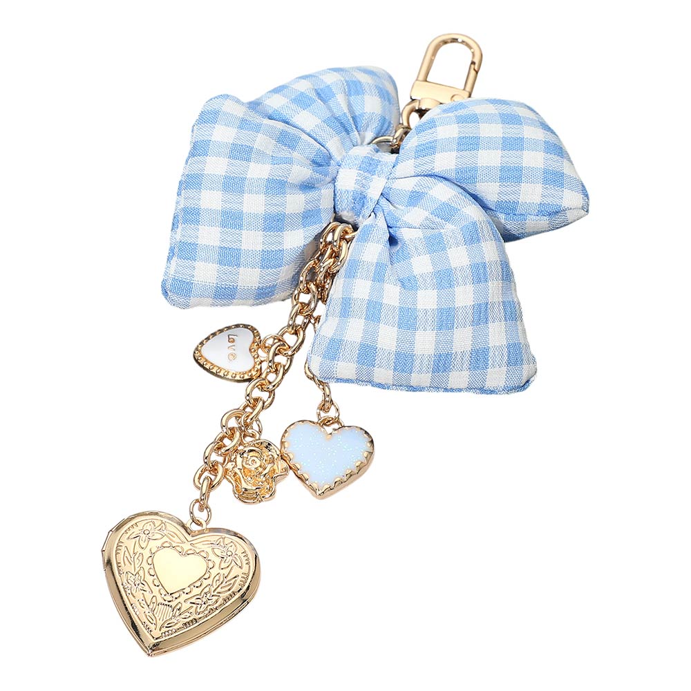 Checkered Bow Accent Heart Locket Charm Drop Keychain Bag Charm
