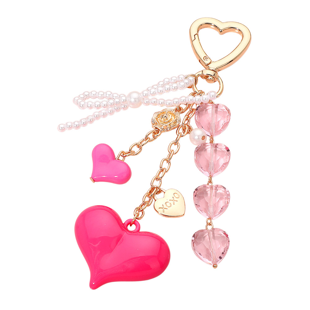 Details • Size : 1.75" X 6" • Cute heart charm keychain featuring a large glossy heart, mini heart accents, pearl bow detail and dangling heart beads. A playful accessory that adds charm to bags or keys, with mixed textures and layered charms for a fun, stylish look. Perfect for gifting or everyday use. • Lead and Nickel Compliant