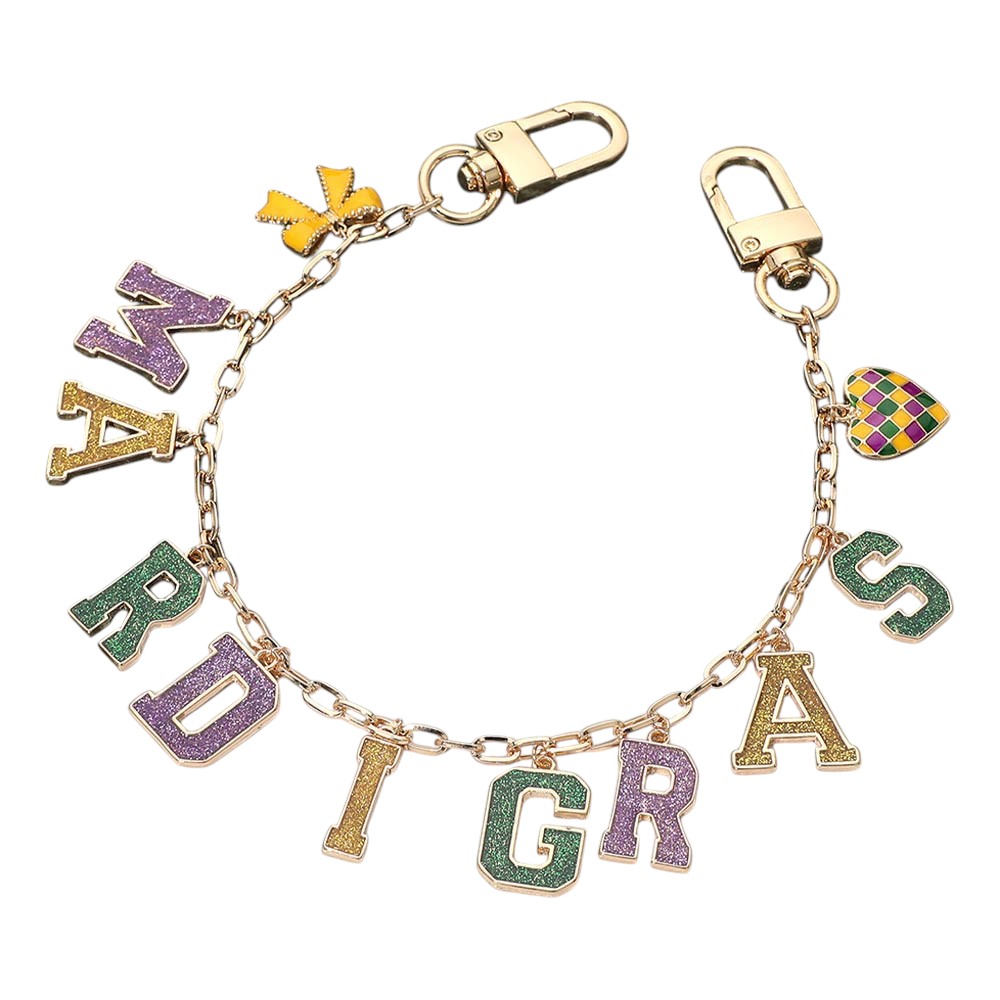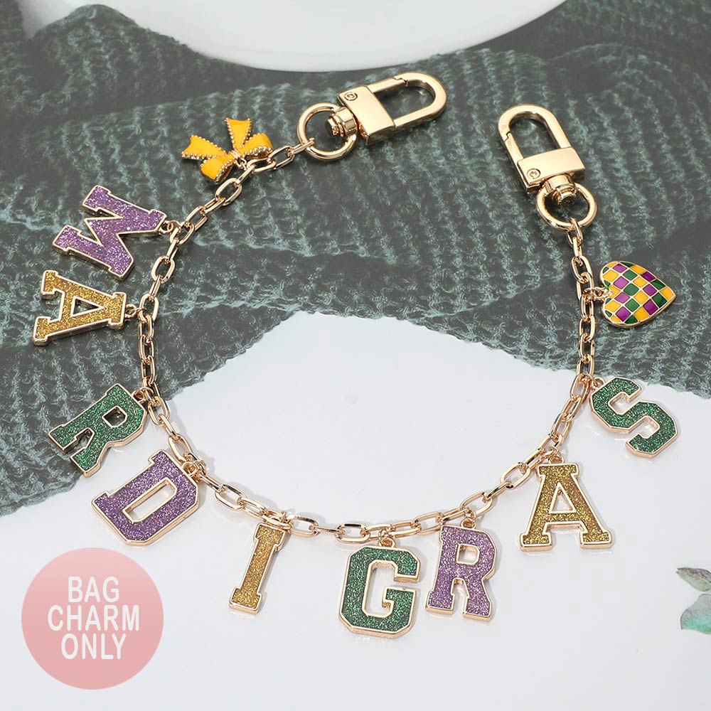 Details • Size : 13" L • Decor Size : 1" L • Festive Mardi Gras–inspired letter charm chain featuring bold alphabet accents, playful icons, and dual clasp ends for easy attachment. Designed to clip onto handbags, totes, backpacks, or keyrings for a standout seasonal look. A fun statement accessory ideal for parade outfits, party styling, gift items, and eye-catching boutique displays. • Lead and Nickel Compliant