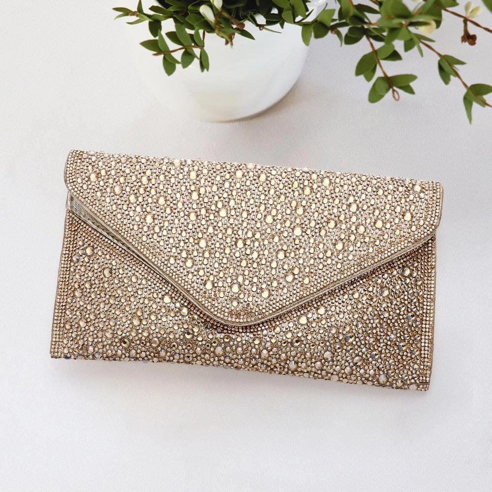 Details • Size : 9" X 5" • Strap Size : 47" L / Detachable • One Inside Slip Pocket • Magnetic Closure • Elevate your formal attire with this glamorous envelope-style clutch, featuring dazzling embellishments and a sleek chain strap. Ideal for weddings, proms, or evening events, this refined accessory adds just the right amount of sparkle to any sophisticated look.