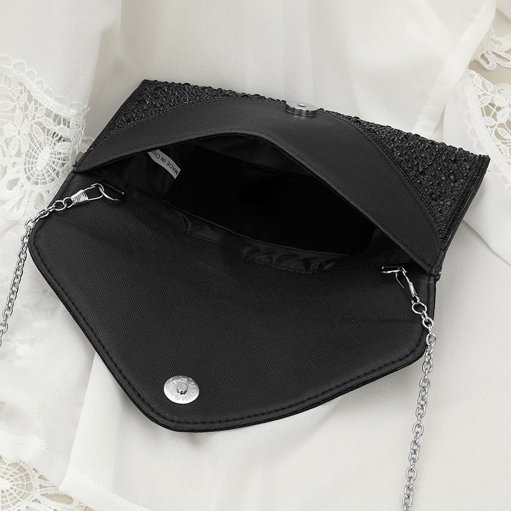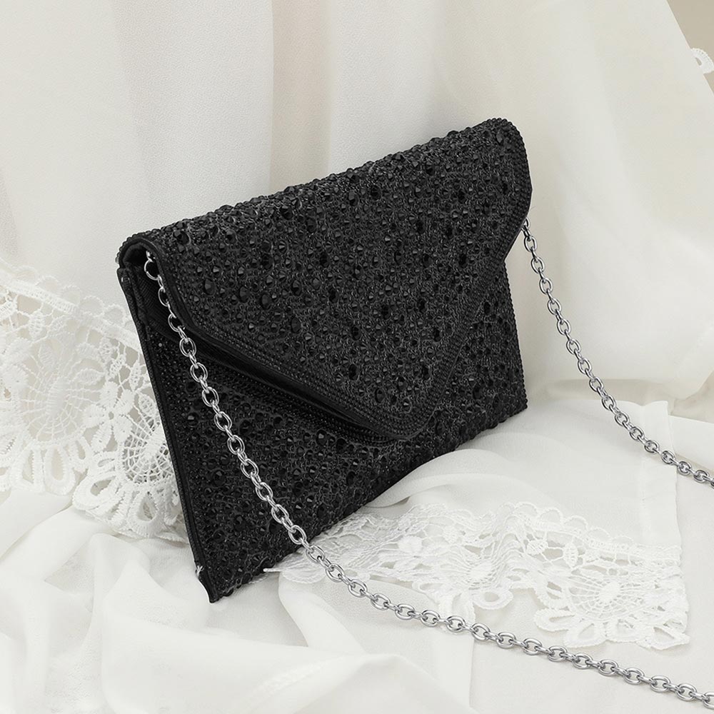 • Elevate your formal attire with this glamorous envelope-style clutch, featuring dazzling embellishments and a sleek chain strap. Ideal for weddings, proms, or evening events, this refined accessory adds just the right amount of sparkle to any sophisticated look.