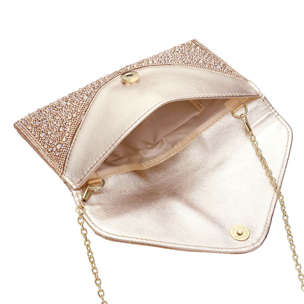 Details • Size : 9" X 5" • Strap Size : 47" L / Detachable • One Inside Slip Pocket • Magnetic Closure • Elevate your formal attire with this glamorous envelope-style clutch, featuring dazzling embellishments and a sleek chain strap. Ideal for weddings, proms, or evening events, this refined accessory adds just the right amount of sparkle to any sophisticated look.