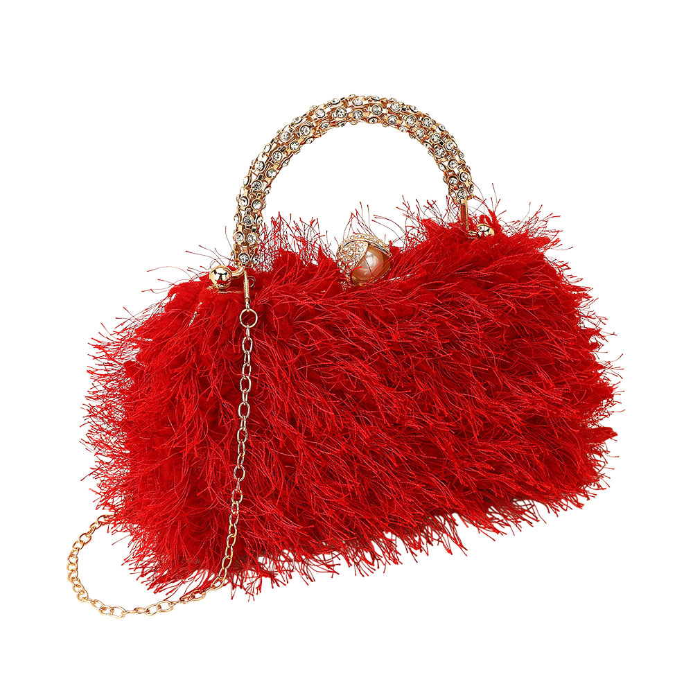 • This elegant evening bag features soft feather accents, a crystal-embellished handle, and a delicate chain strap for versatile carrying. Perfect for formal events or glamorous nights out, it adds a statement touch of luxury and sophistication to any outfit.