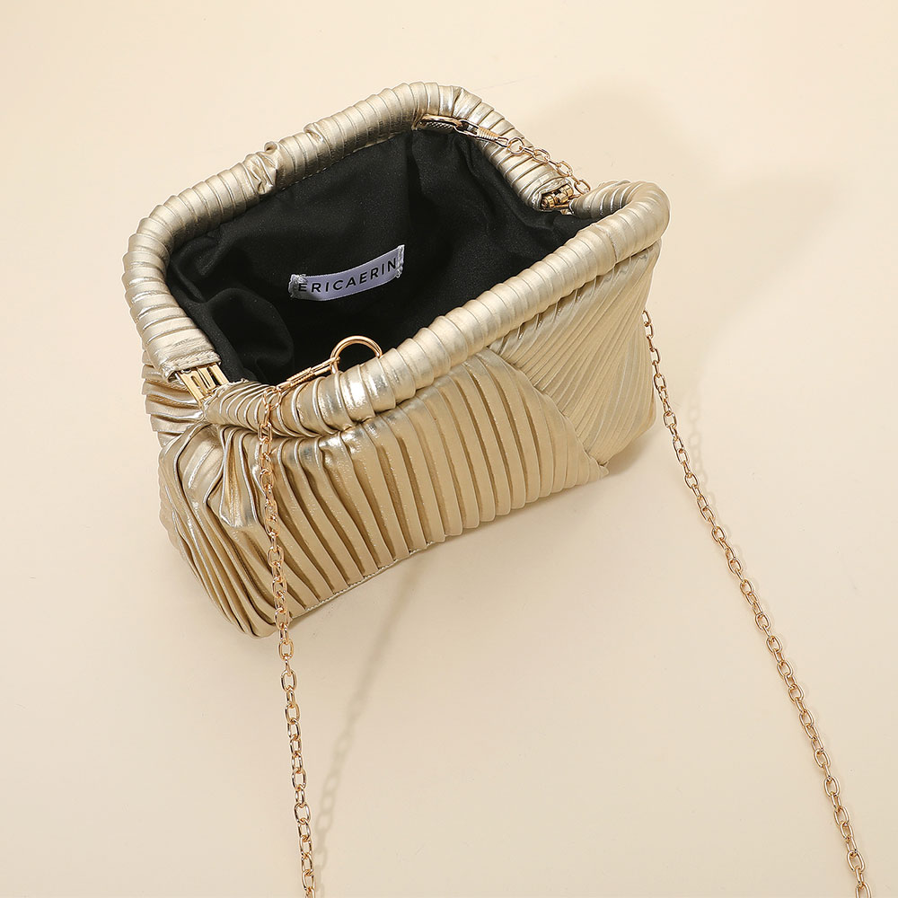 • This refined evening clutch showcases a sculpted, pleated exterior with a soft, structured silhouette that adds dimension and elegance. A detachable chain strap offers styling versatility, making it an ideal accessory for special events, nights out, or polished everyday looks.