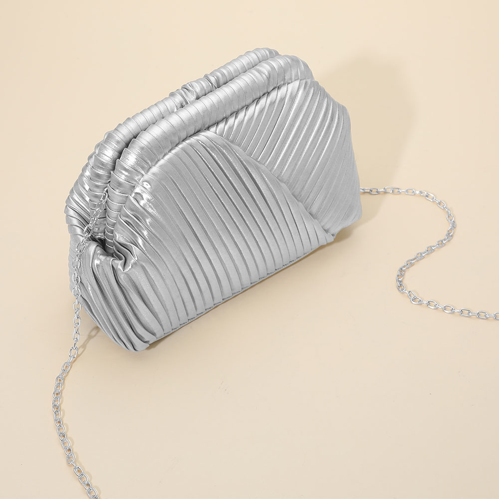 Details • Size : 9" X 6" X 2.5" • Strap Size : 46" L / Detachable • One Inside Slip Pocket • Clasp Closure • This refined evening clutch showcases a sculpted, pleated exterior with a soft, structured silhouette that adds dimension and elegance. A detachable chain strap offers styling versatility, making it an ideal accessory for special events, nights out, or polished everyday looks.