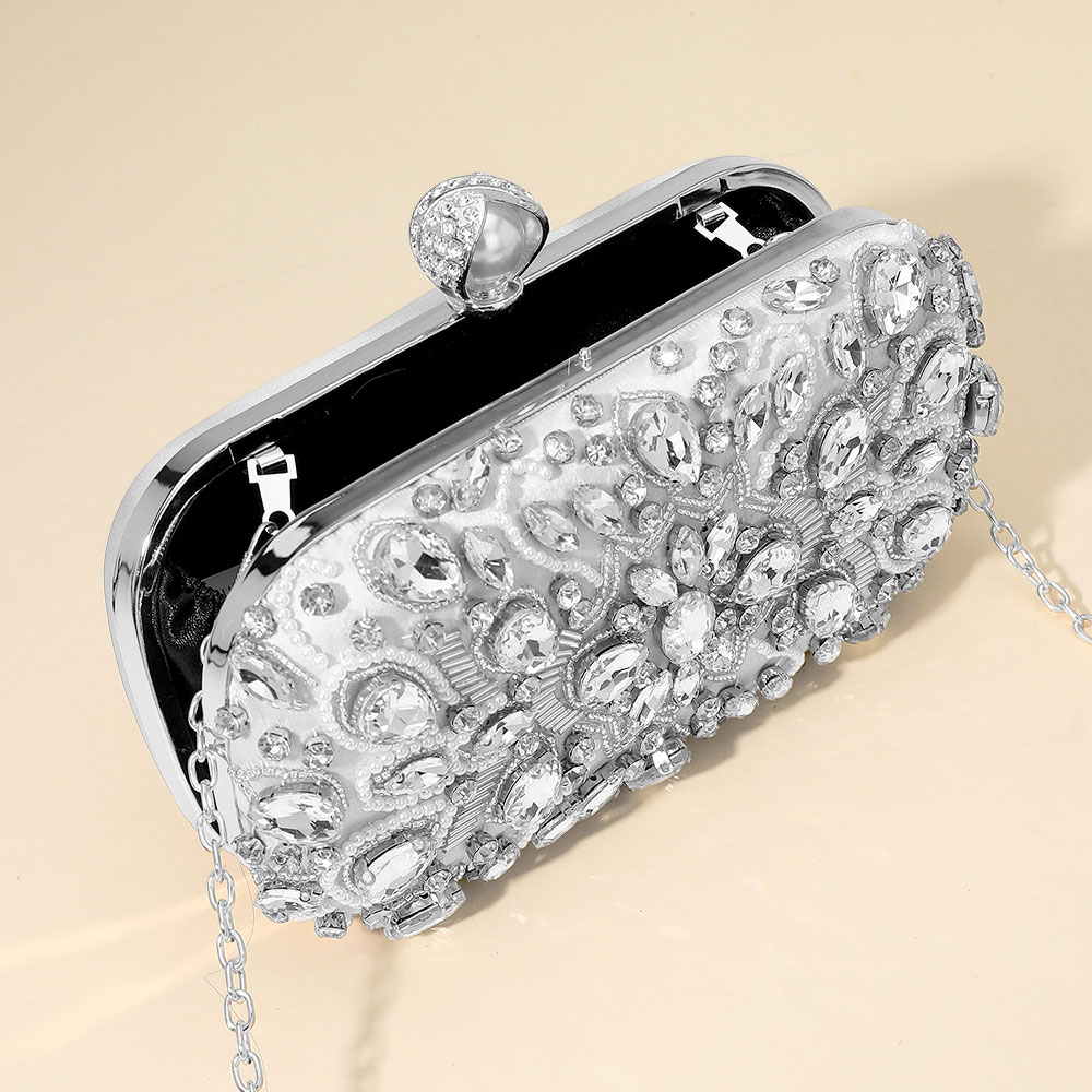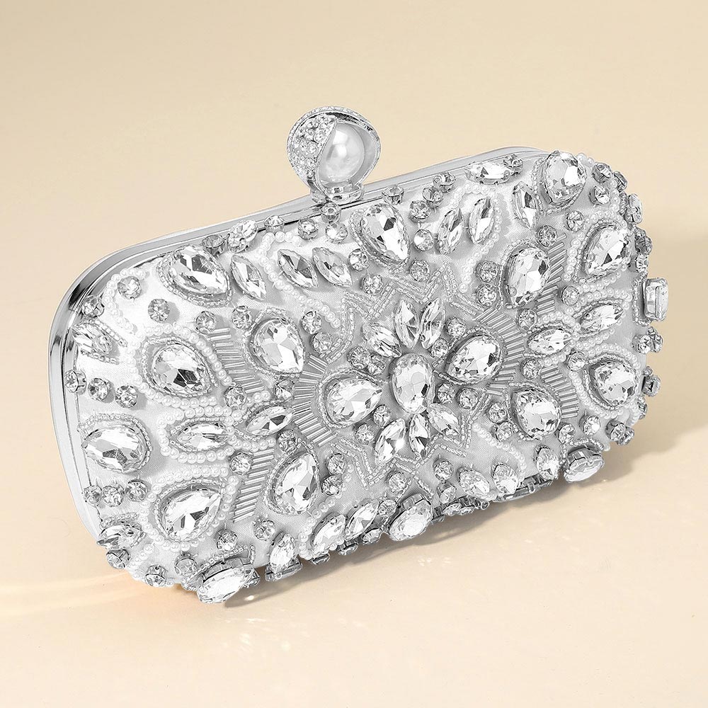 • This stunning evening clutch dazzles with intricate crystal embellishments and a luxurious pearl clasp for a sophisticated finish. Designed with a detachable chain strap, it’s ideal for weddings, galas, or special occasions, adding a radiant touch of glamour to any formal outfit.