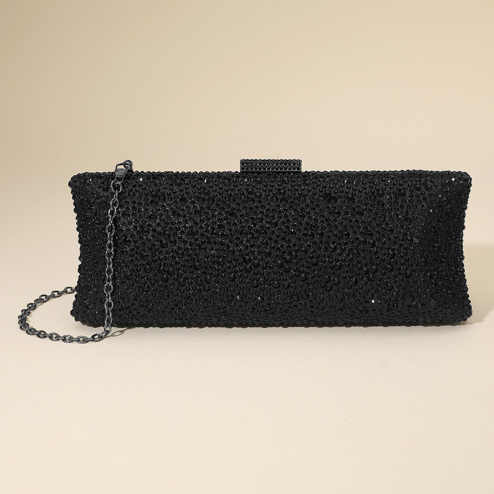 Details • Size : 9.5" X 4" X 2.25" • Strap Size : 46" L / Detachable • Clasp Closure • This dazzling rhinestone clutch adds instant glamour to any evening look. Featuring a sleek rectangular design and a detachable chain strap, it offers versatile carry options. Perfect for weddings, parties, or formal events, this clutch keeps essentials secure in chic style.