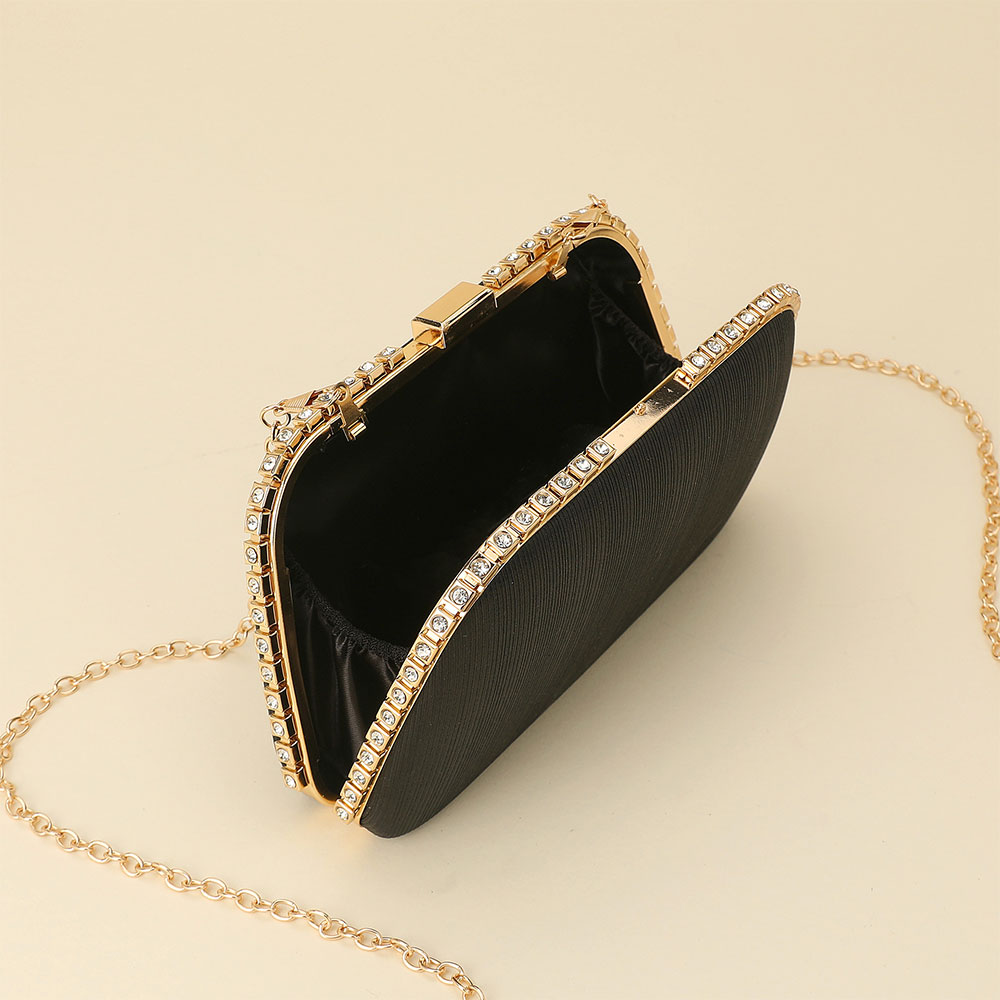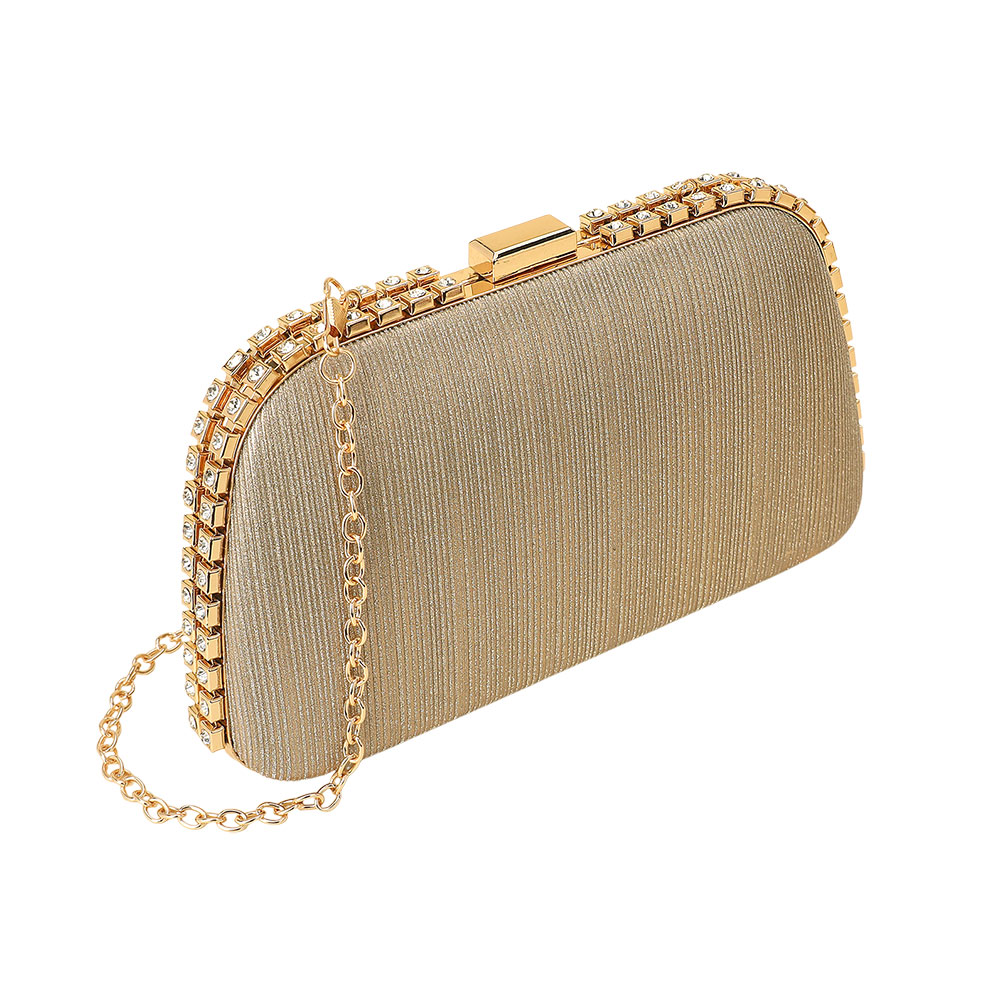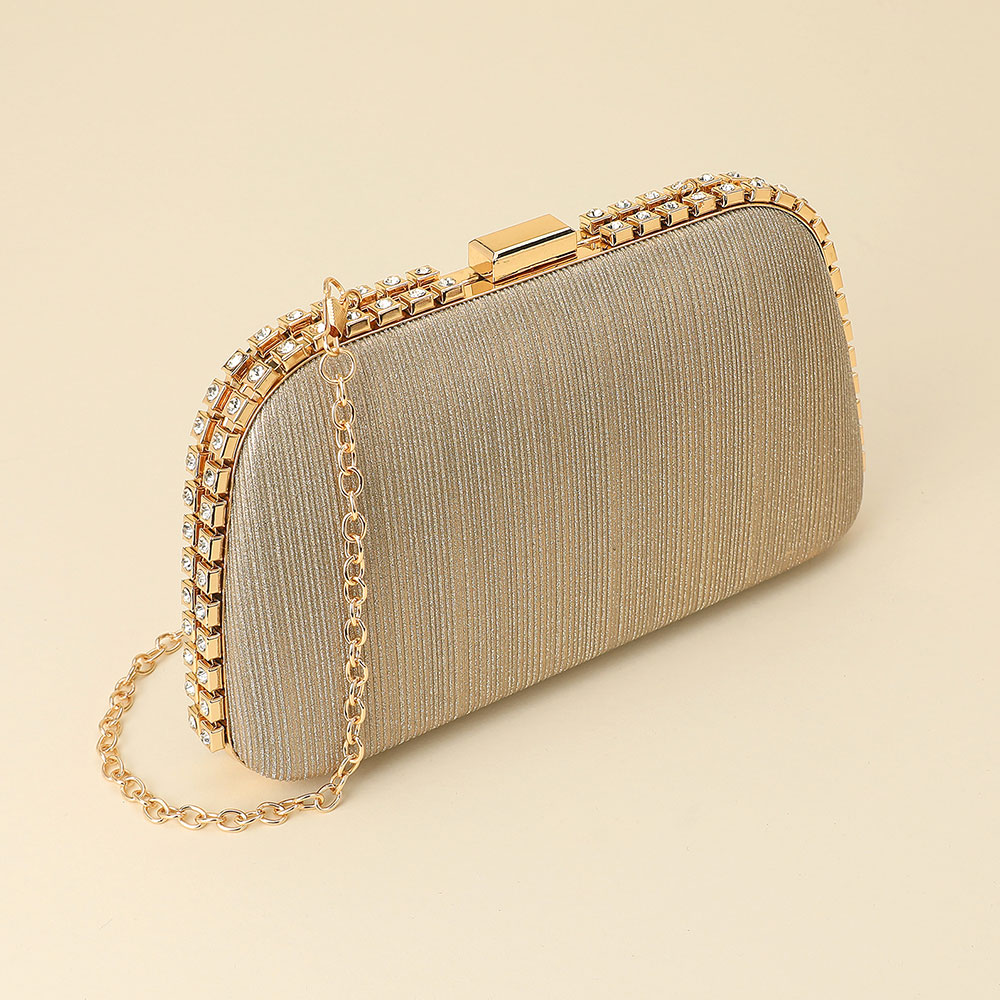 • Chic evening clutch featuring a textured finish, shimmering rhinestone trim, and a detachable chain strap. Designed with a sleek clasp closure and gold-tone accents, this sophisticated handbag is perfect for weddings, parties, and formal events, adding timeless glamour to any outfit.