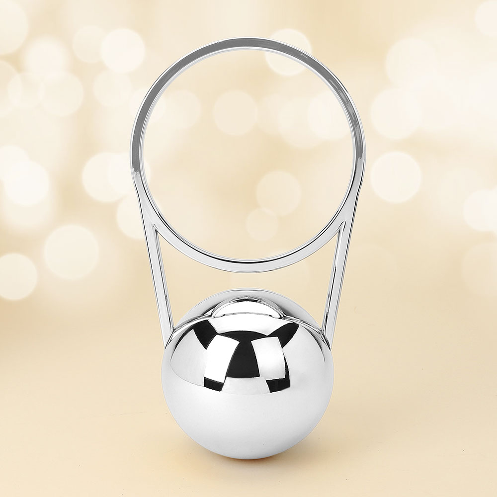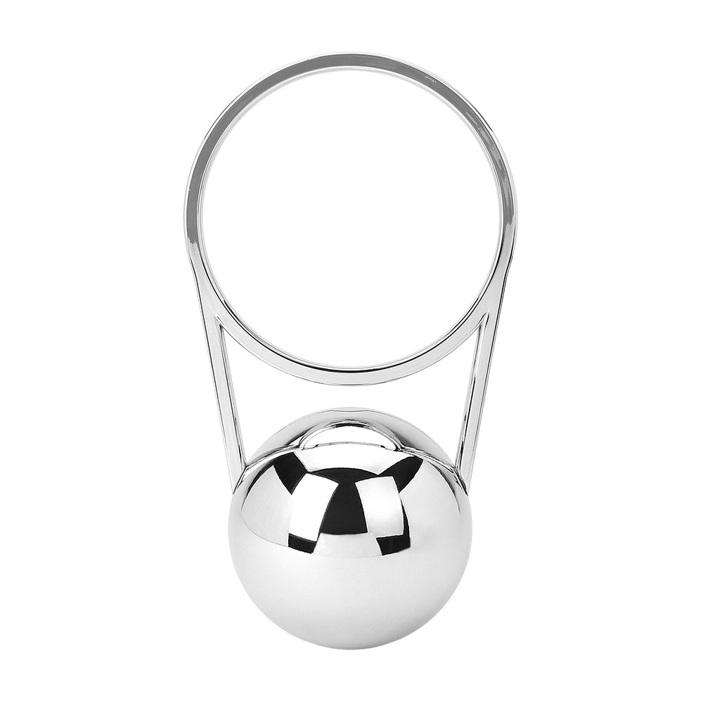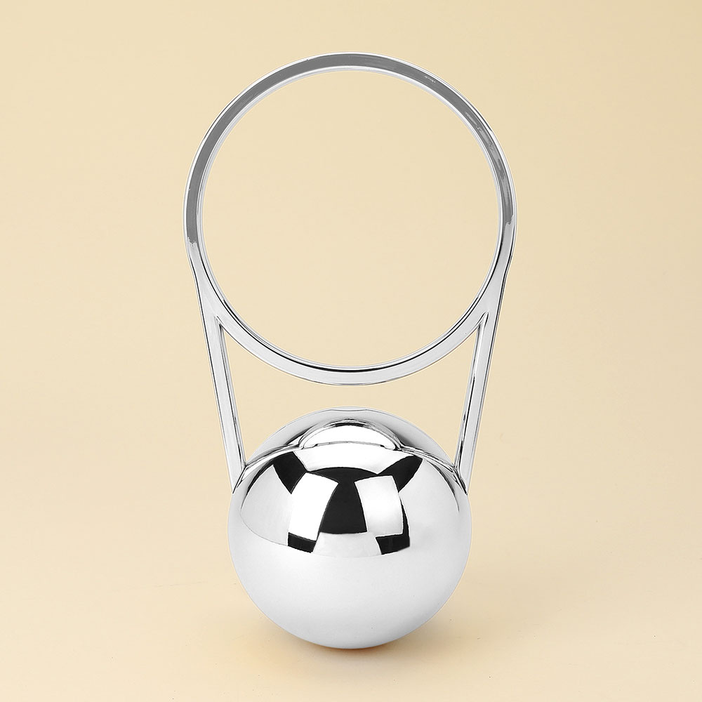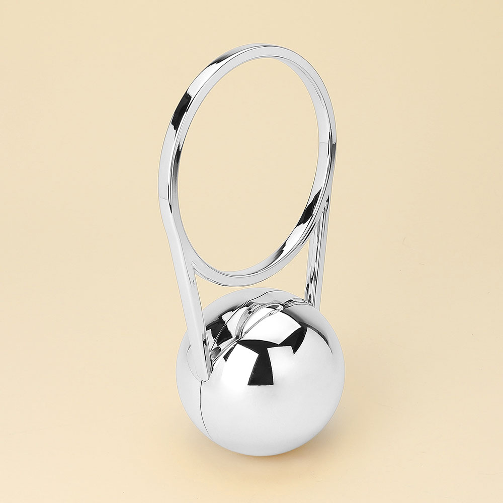 • This sculptural orb evening clutch showcases a sleek geometric design with a circular ring handle for a statement look. Its structured silhouette and polished finish bring a modern touch to formal and chic outfits, making it a standout accessory for special occasions.