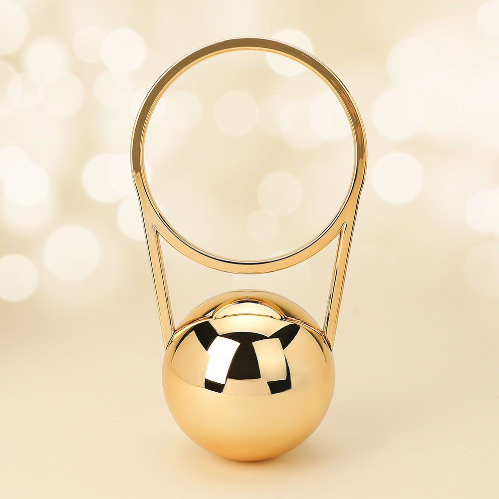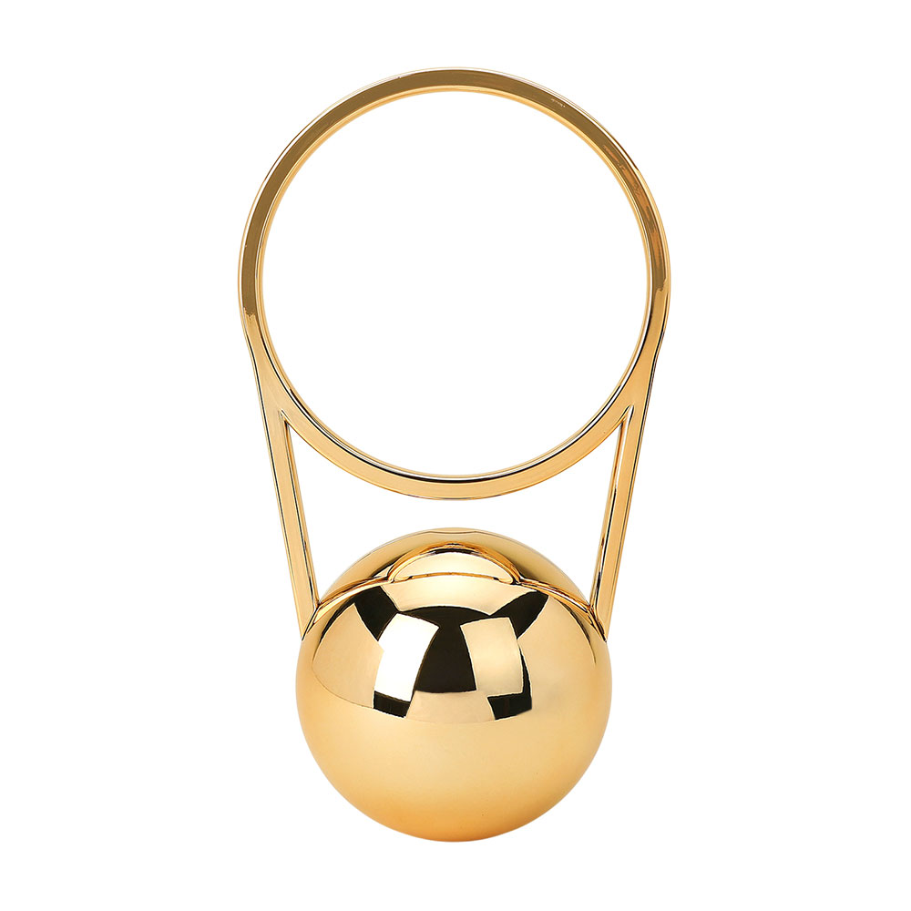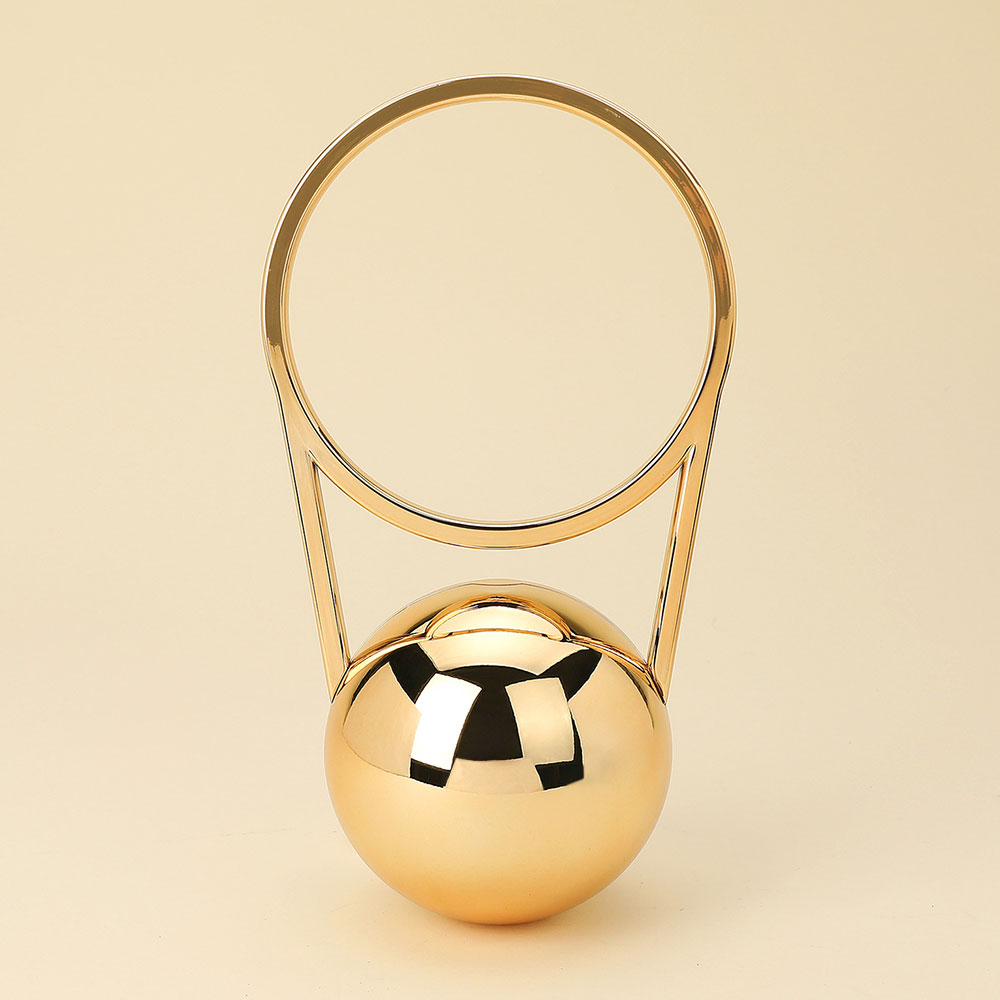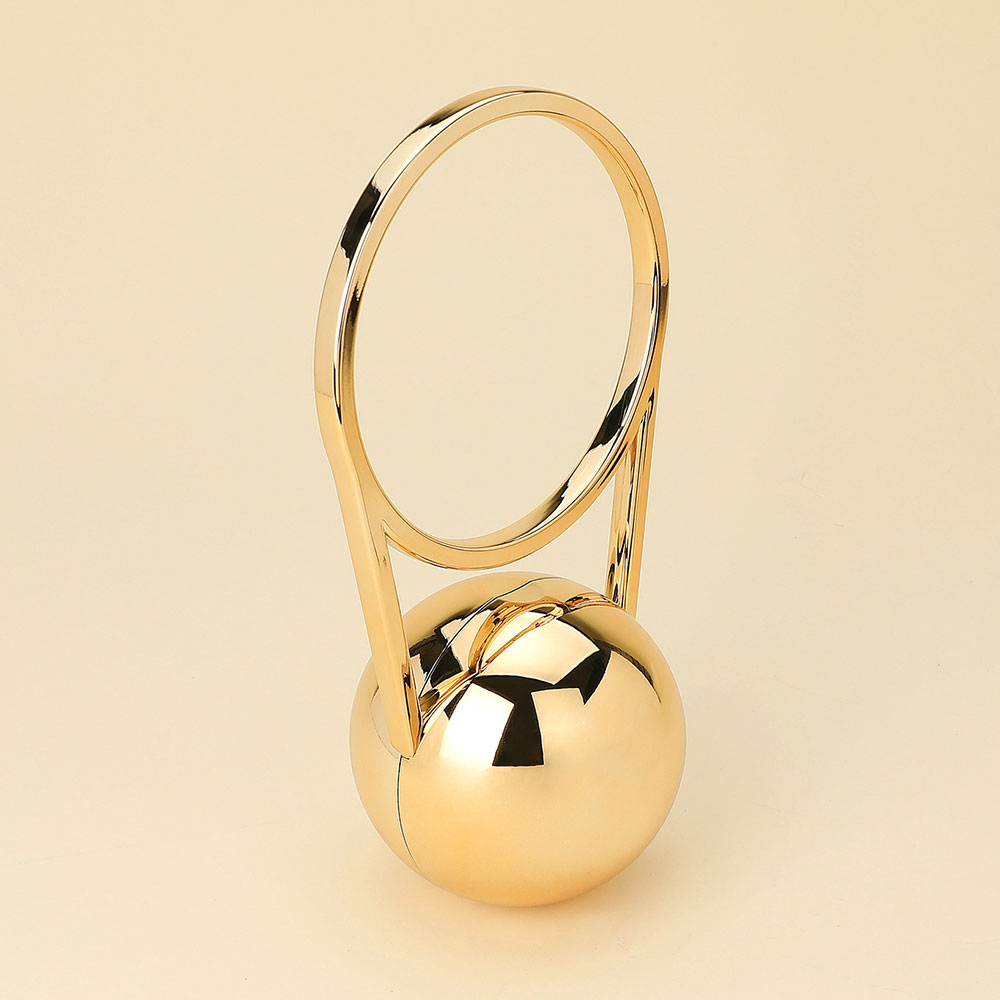 • This sculptural orb evening clutch showcases a sleek geometric design with a circular ring handle for a statement look. Its structured silhouette and polished finish bring a modern touch to formal and chic outfits, making it a standout accessory for special occasions.