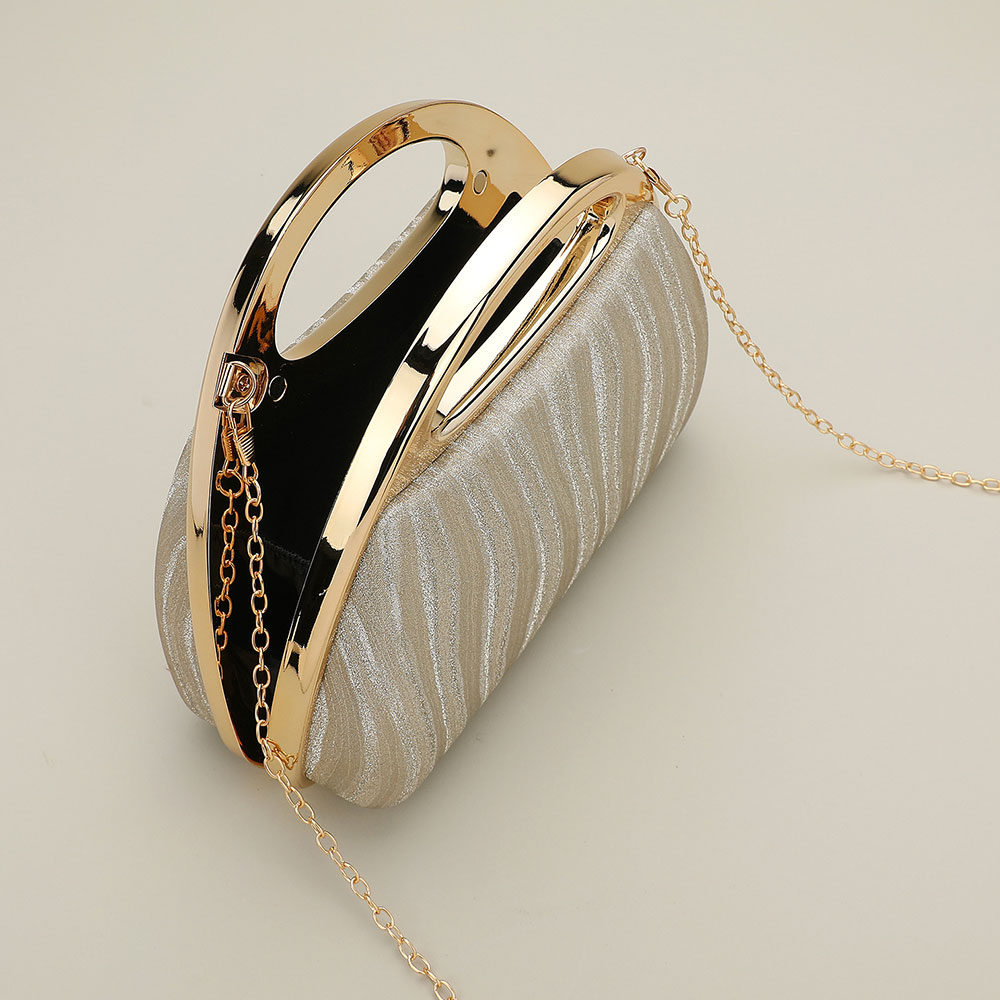 Details • Size : 8.5" X 6.5" X 3" • Top Handle Size : 2" L • Strap Size : 46"L • Clasp Closure • A refined evening handbag featuring a sculpted silhouette, metallic handle, and shimmering textured body. Designed for formal events, it offers a polished finish and a detachable chain for versatile styling, keeping essentials organized while enhancing any sophisticated look.