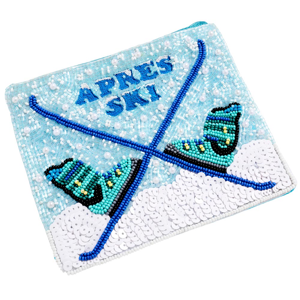 Details • Size : 5.5" X 4.5" (appx) • No Inside Pocket • Beads On Front Only • Bag Only (items are not included) • Zipper Closure • Statement zipper pouch featuring detailed beaded Apres Ski design, perfect for storing cosmetics, travel essentials, or small accessories. A fun, resort-inspired accessory ideal for seasonal displays, gift shops, and boutique collections, offering strong visual appeal and everyday practicality for trend-driven retail assortments. • Made In India