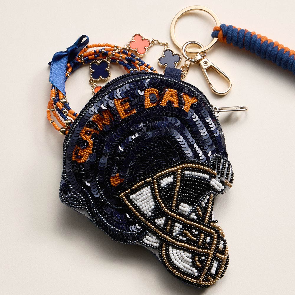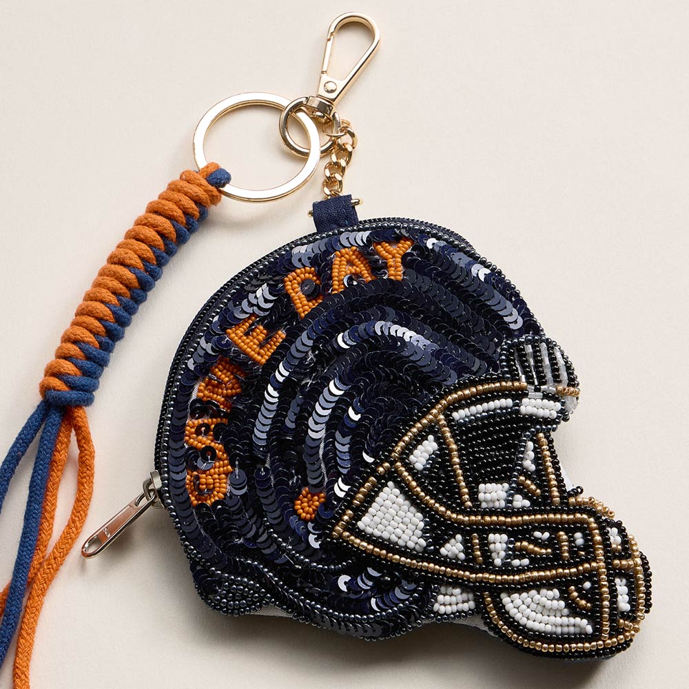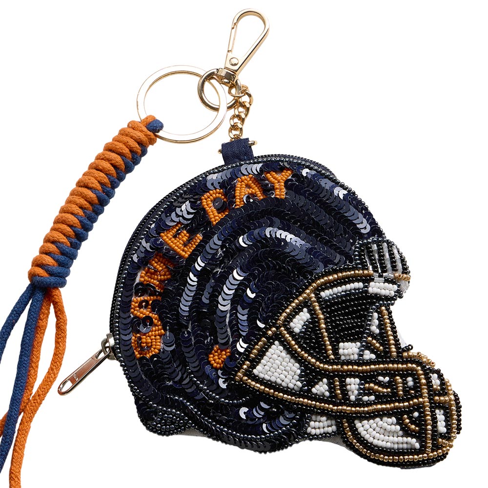 Details • Size : 4.5" X 4.75" (appx) • Decor Size : 9" L • No Inside Pocket • Beads On Front Only • Bag Only (items are not included) • Zipper Closure • Eye-catching helmet-shaped keychain pouch designed with detailed beadwork and zip closure for small essentials. Perfect for game day displays, sports-themed collections, gifting, and impulse buys, this compact accessory adds playful personality while offering practical storage on the go. • Made In India