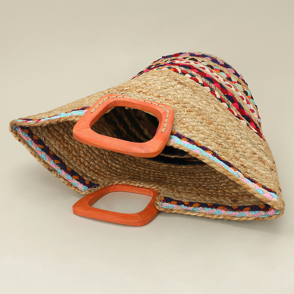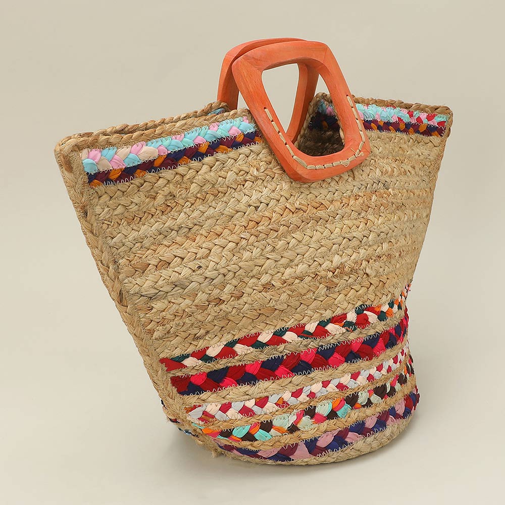 Details • Size : 19.5" X 11.5" X 7.75" • Top Handle Size : 5" L • Spacious woven tote bag designed with braided accent detailing and a structured top handle for easy everyday carry. Roomy interior fits daily essentials while the bold patterned design adds visual interest. Ideal for shopping, travel, beach days, or boutique collections seeking statement-making, functional accessories. • Made In India