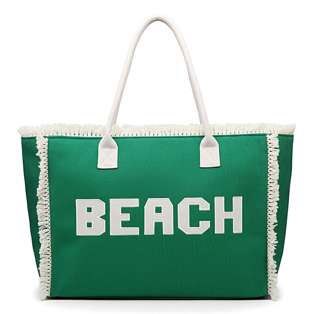 Details • Size : 17.5" X 14" X 5" • Inner Pocket • Zipper Closure • Material : 100% Polyester • Statement oversized tote bag with bold BEACH lettering, perfect for travel, vacations, pool days, and everyday carry. Open interior fits towels, clothing, and essentials with ease. Comfortable shoulder straps make it ideal for resorts, boutiques, and seasonal displays.
