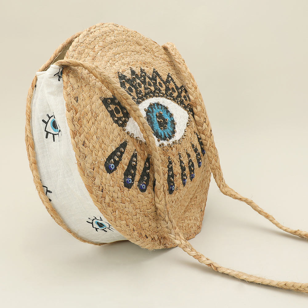 Details • Size : 13" X 13" X 3.25" • Strap Size : 18.5" L • Two Inside Slip Pockets • Zipper Closure • Statement round shoulder bag designed with a bold evil eye motif and detailed embellishment for standout everyday style. Compact yet functional interior holds daily essentials with ease. Lightweight and easy to carry, ideal for vacations, festivals, and boutiques seeking trend-forward, eye-catching accessories. • Made In India